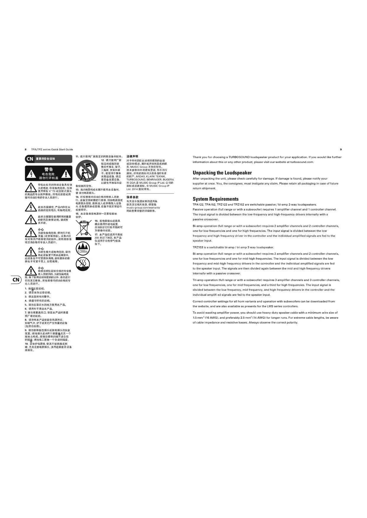 new MUSIC Group equipment right after you purchase it by visiting turbosound. com. Registering your purchase using our simple online form helps us to process your repair claims more quickly and effi ciently. Also, read the terms and conditions of our warranty, if applicable.