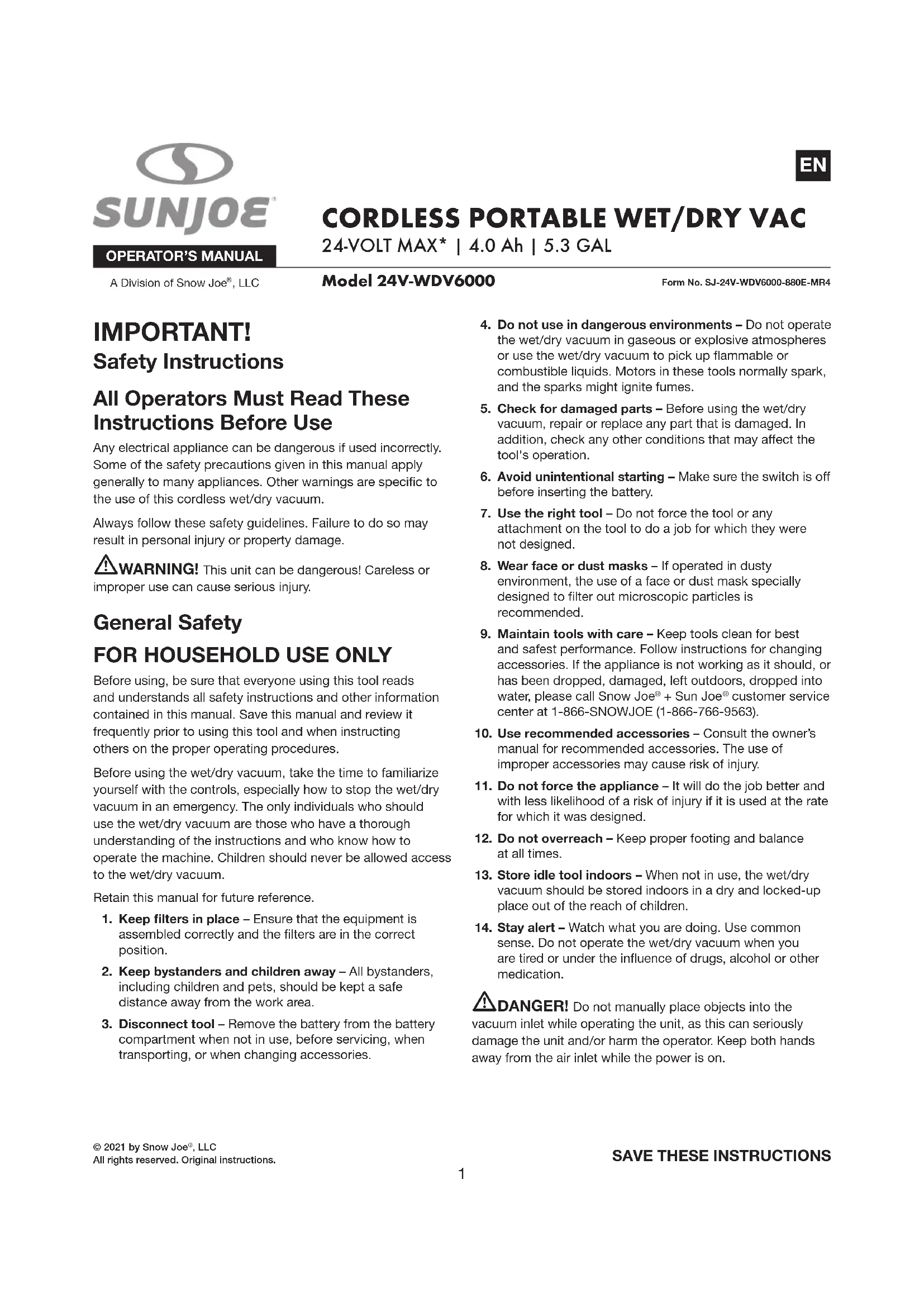 Download the instructions for your Vacuum Cleaner in PDF format for free! Find your manual 24VWDV6000CT - Sun Joe and take your electronic device back in hand. On this page are published all the documents necessary for the use of your device. 24VWDV6000CT by Sun Joe.