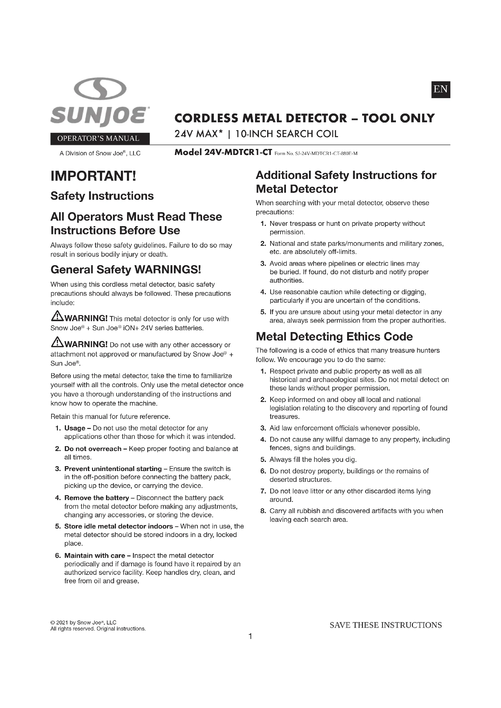 IMPORTANT! Safety Instructions All Operators Must Read These Instructions Before Use Always follow these safety guidelines. Failure to do so may result in serious bodily injury or death. General Safety WARNINGS! When using this cordless metal detector, basic safety precautions should always be followed. These precautions include: mWARNING! This metal detector is only for use with Snow Joe