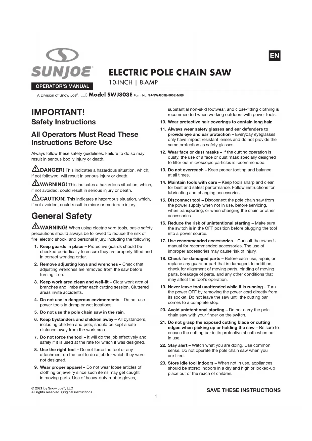 Download the instructions for your Saw in PDF format for free! Find your manual SWJ803ECMO - Sun Joe and take your electronic device back in hand. On this page are published all the documents necessary for the use of your device. SWJ803ECMO by Sun Joe.