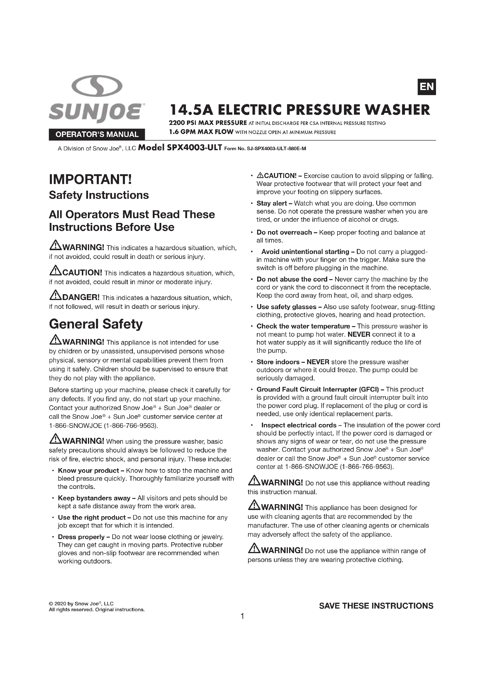 customer service center at 1-866-SNOWJOE (1-866-766-9563). mWARNING! Do not use this appliance without reading this instruction manual. mWARNING! This appliance has been designed for use with cleaning agents that are recommended by the manufacturer. The use of other cleaning agents or chemicals may adversely aect the safety of the appliance. mWARNING! Do not use the appliance within range of persons unless they are wearing protective clothing.2 mWARNING! High-pressure jets can be dangerous if subject to misuse. The jet must not be directed at persons, pets, live electrical equipment, or the appliance itself.