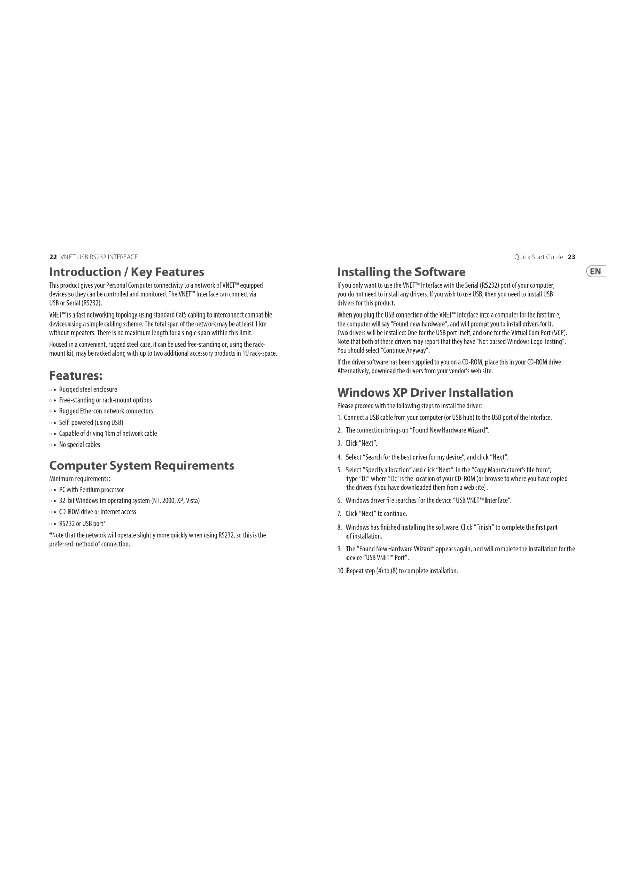 - • RS232 or USB port* *Note that the network will operate slightly more quickly when using RS232, so this is the preferred method of connection. Installing the Software If you only want to use the VNET™ Interface with the Serial (RS232) port of your computer, you do not need to install any drivers. If you wish to use USB, then you need to install USB drivers for this product. When you plug the USB connection of the VNET™ Interface into a computer for the rst time, the computer will say “Found new hardware”, and will prompt you to install drivers for it. Two drivers will be installed: One for the USB port itself, and one for the Virtual Com Port (VCP). Note that both of these drivers may report that they have “Not passed Windows Logo Testing”. You should select “Continue Anyway”. If the driver software has been supplied to you on a CD-ROM, place this in your CD-ROM drive. Alternatively, download the drivers from your vendor’s web site. Windows XP Driver Installation Please proceed with the following steps to install the driver: