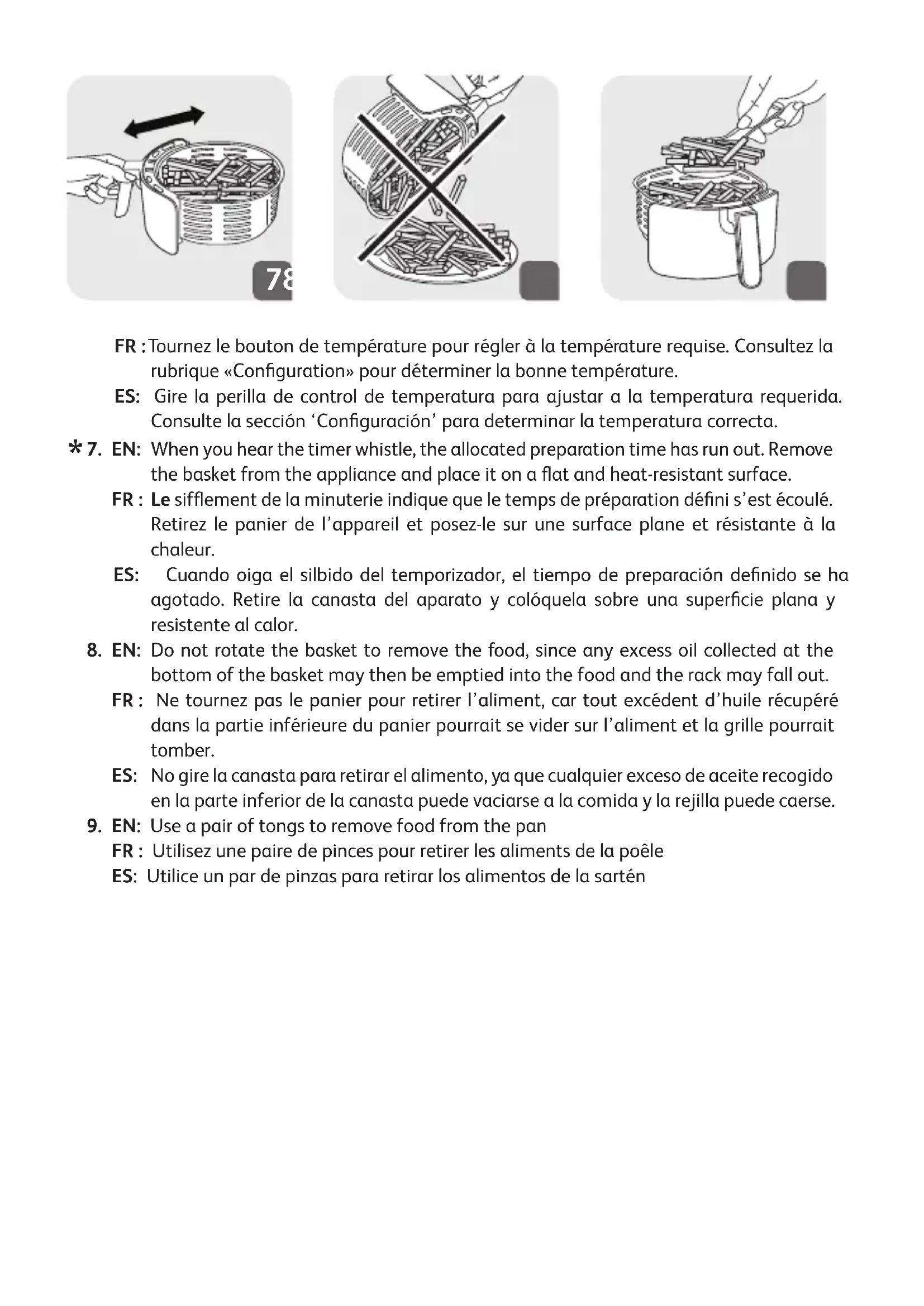 bottom of the basket may then be emptied into the food and the rack may fall out. FR: Ne tournez pas le panier pour retirer l’aliment, car tout excédent d’huile récupéré dans la partie inférieure du panier pourrait se vider sur l’aliment et la grille pourrait tomber. ES: No gire la canasta para retirar el alimento, ya que cualquier exceso de aceite recogido en la parte inferior de la canasta puede vaciarse a la comida y la rejilla puede caerse.