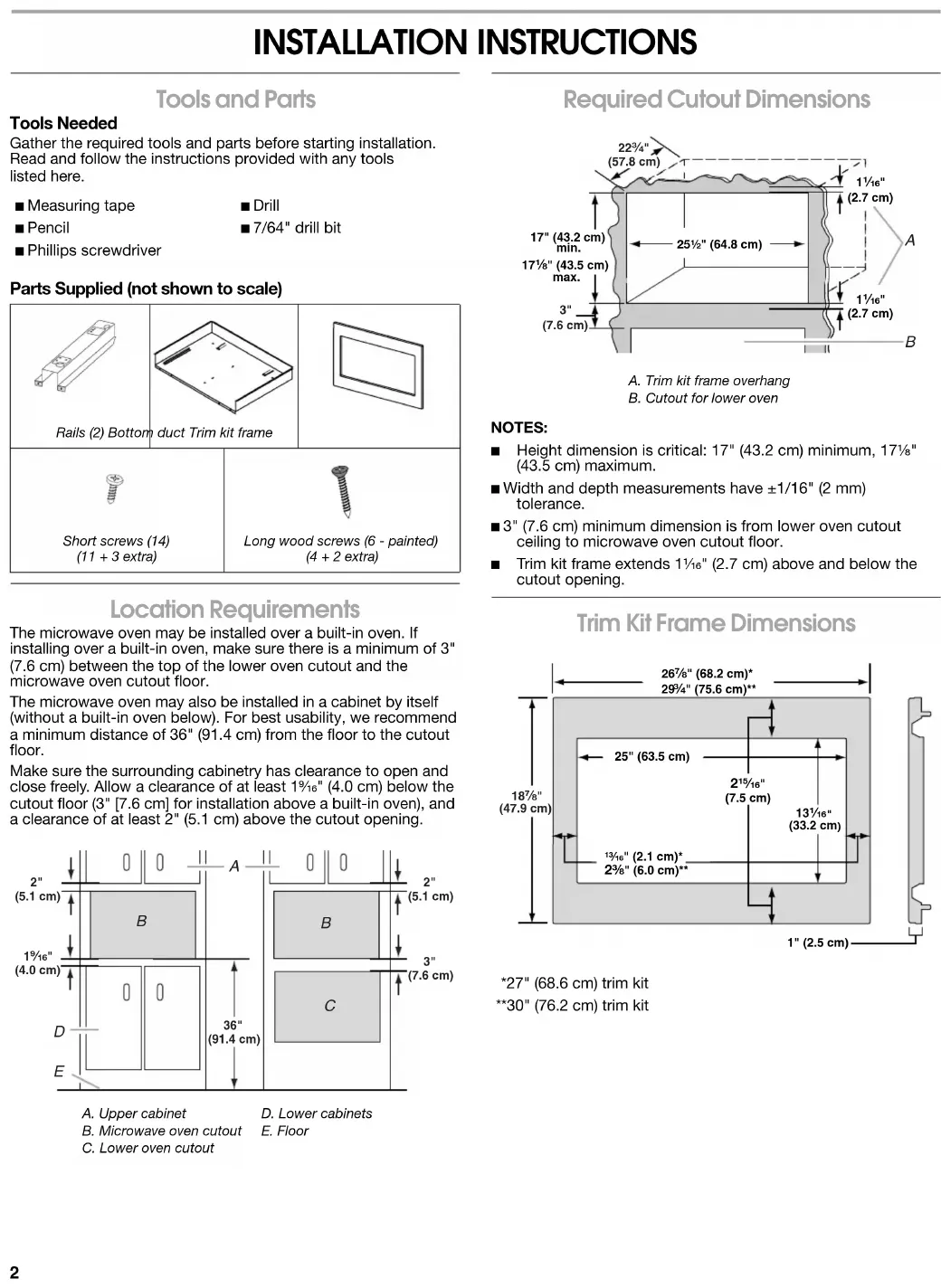 - Installation du cadre de la trousse de garniture W10434148A You can be killed or seriously injured if you don't immediately You can be killed or seriously injured if you don'tfollow All safety messages will tell you what the potential hazard is, tell you how to reduce the chance of injury, and tell you what can happen if the instructions are not followed. Your safety and the safety of others are very important. We have provided many important safety messages in this manual and on your appliance. Always read and obey all safety messages.This is the safety alert symbol.This symbol alerts you to potential hazards that can kill or hurt you and others.All safety messages will follow the safety alert symbol and either the word “DANGER” or “WARNING.”These words mean:follow instructions.instructions. DANGER WARNING2 INSTALLATION INSTRUCTIONS Tools and Parts Tools Needed Gather the required tools and parts before starting installation. Read and follow the instructions provided with any tools listed here. Parts Supplied (not shown to scale) Location Requirements The microwave oven may be installed over a built-in oven. If installing over a built-in oven, make sure there is a minimum of 3" (7.6 cm) between the top of the lower oven cutout and the microwave oven cutout floor. The microwave oven may also be installed in a cabinet by itself (without a built-in oven below). For best usability, we recommend a minimum distance of 36" (91.4 cm) from the floor to the cutout floor. Make sure the surrounding cabinetry has clearance to open and close freely. Allow a clearance of at least 1⁹⁄₁₆" (4.0 cm) below the cutout floor (3" [7.6 cm] for installation above a built-in oven), and a clearance of at least 2" (5.1 cm) above the cutout opening. Required Cutout Dimensions NOTES: ■ Height dimension is critical: 17" (43.2 cm) minimum, 17¹⁄₈" (43.5 cm) maximum. ■ Width and depth measurements have ±1/16" (2 mm) tolerance. ■ 3" (7.6 cm) minimum dimension is from lower oven cutout ceiling to microwave oven cutout floor. ■ Trim kit frame extends 1¹⁄₁₆" (2.7 cm) above and below the cutout opening. Trim Kit Frame Dimensions *27" (68.6 cm) trim kit **30" (76.2 cm) trim kit ■ Measuring tape■ Pencil■ Phillips screwdriver■ Drill■ 7/64" drill bitRails (2) Bottom duct Trim kit frameShort screws (14)(11 + 3 extra)Long wood screws (6 - painted)(4 + 2 extra)A. Upper cabinetB. Microwave oven cutoutC. Lower oven cutoutD. Lower cabinetsE. Floor 3"(7.6 cm) p. 11