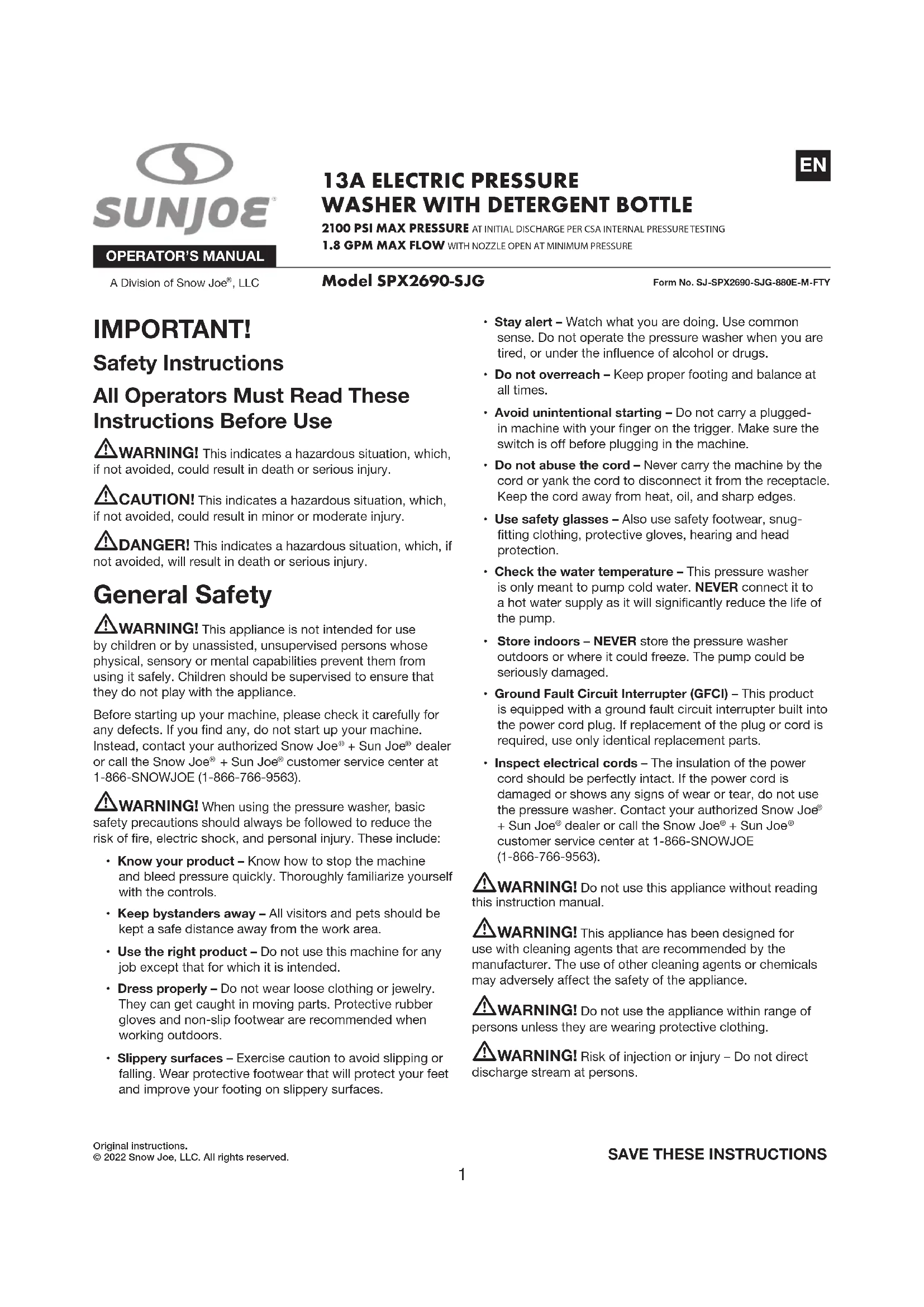 Form No. SJ-SPX2690-SJG-880E-M-FTY Model SPX2690-SJG IMPORTANT! Safety Instructions All Operators Must Read These Instructions Before Use mWARNING! This indicates a hazardous situation, which, if not avoided, could result in death or serious injury. mCAUTION! This indicates a hazardous situation, which, if not avoided, could result in minor or moderate injury. mDANGER! This indicates a hazardous situation, which, if not avoided, will result in death or serious injury. General Safety mWARNING! This appliance is not intended for use by children or by unassisted, unsupervised persons whose physical, sensory or mental capabilities prevent them from using it safely. Children should be supervised to ensure that they do not play with the appliance.Before starting up your machine, please check it carefully for any defects. If you nd any, do not start up your machine. Instead, contact your authorized Snow Joe + Sun Joe dealer or call the Snow Joe + Sun Joe customer service center at 1-866-SNOWJOE (1-866-766-9563). mWARNING! When using the pressure washer, basic safety precautions should always be followed to reduce the risk of fire, electric shock, and personal injury. These include:• Know your product – Know how to stop the machine and bleed pressure quickly. Thoroughly familiarize yourself with the controls.• Keep bystanders away – All visitors and pets should be kept a safe distance away from the work area.• Use the right product – Do not use this machine for any job except that for which it is intended.• Dress properly – Do not wear loose clothing or jewelry. They can get caught in moving parts. Protective rubber gloves and non-slip footwear are recommended when working outdoors.• Slippery surfaces – Exercise caution to avoid slipping or falling. Wear protective footwear that will protect your feet and improve your footing on slippery surfaces.• Stay alert – Watch what you are doing. Use common sense. Do not operate the pressure washer when you are tired, or under the influence of alcohol or drugs.• Do not overreach – Keep proper footing and balance at all times.• Avoid unintentional starting – Do not carry a plugged-in machine with your finger on the trigger. Make sure the switch is off before plugging in the machine.• Do not abuse the cord – Never carry the machine by the cord or yank the cord to disconnect it from the receptacle. Keep the cord away from heat, oil, and sharp edges.• Use safety glasses – Also use safety footwear, snug-fitting clothing, protective gloves, hearing and head protection.• Check the water temperature – This pressure washer is only meant to pump cold water. NEVER connect it to a hot water supply as it will significantly reduce the life of the pump.