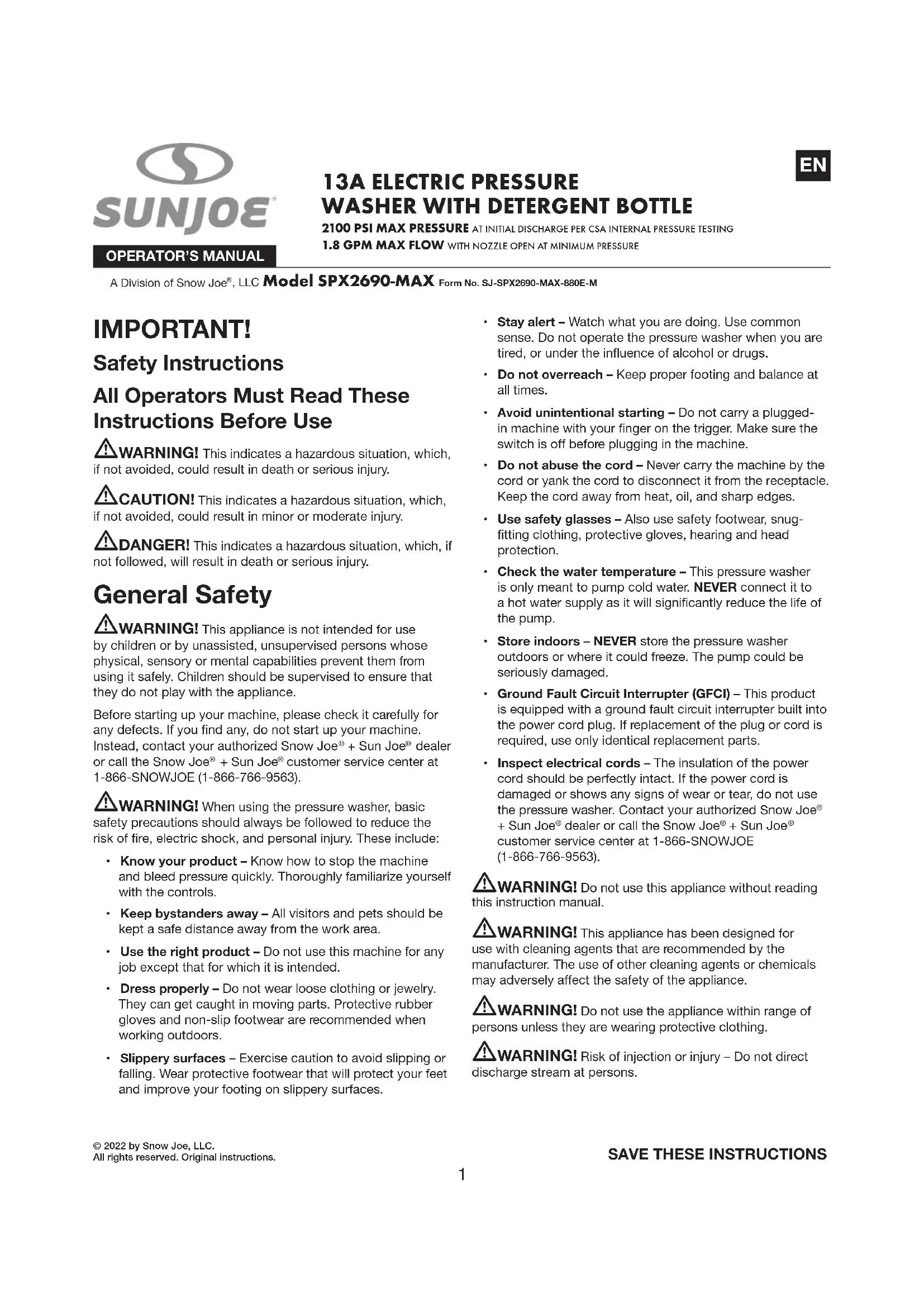 Download the instructions for your Pressure washer in PDF format for free! Find your manual SPX2690MAX - Sun Joe and take your electronic device back in hand. On this page are published all the documents necessary for the use of your device. SPX2690MAX by Sun Joe.