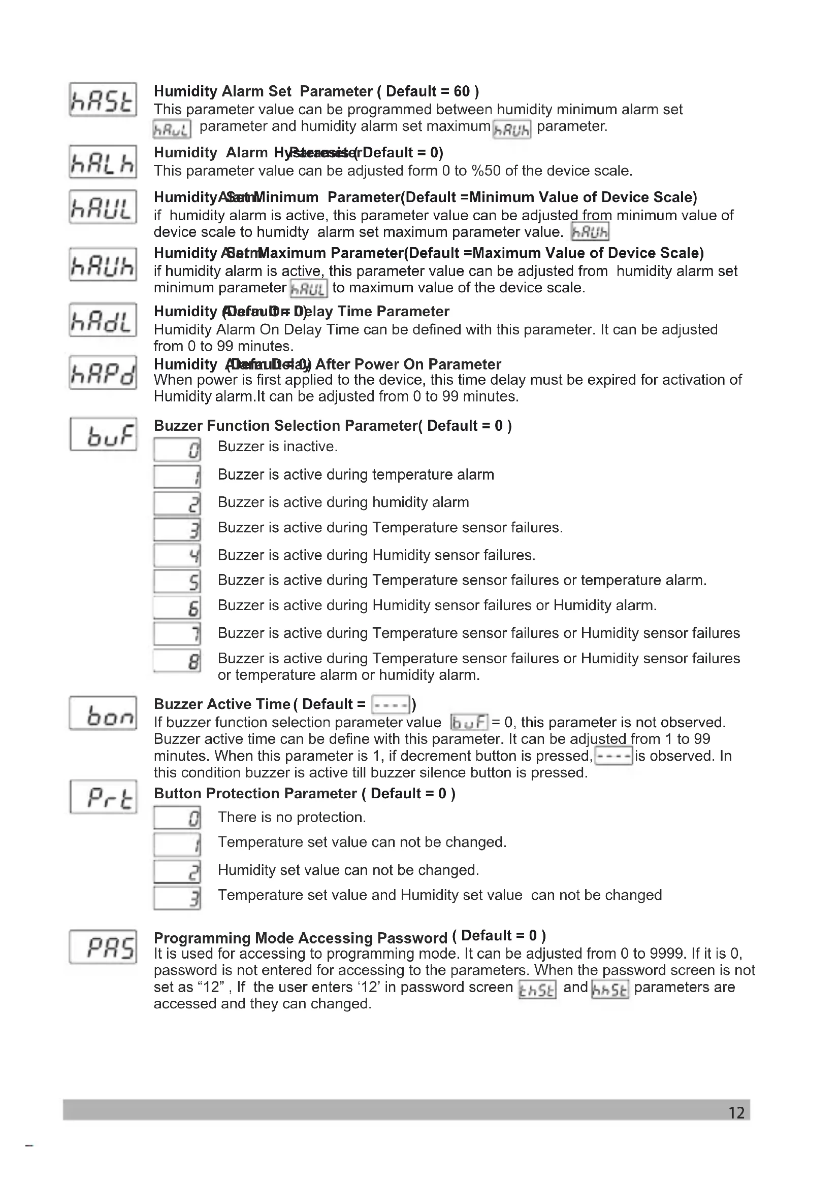OFF Humidity Control Output Set hhSt Time hhSt Time11 Humidity Alarm Function Selection Parameter ( Default = 0 ) Maximum Humidity Set Value Parameter (Default = Maximum Value of Device Scale) This parameter value can be adjusted from minimum humidity set value parameter to maximum value of the device scale. Humidity set value can not be greater than this value. Minimum Humidity Set Value Parameter (Default = Minimum Value of Device Scale) set value can not be lower than this value. This parameter value can be adjusted from minimum value of device scale to maximum set value parameter Humidity Humidity Humidity Sensor Offset Parameter ( Default = 0.0 ) From -10 to 10%RH for Humidity Sensor (0%RH-100%RH) From -10.0 to 10.0%RH for Humidity Sensor (0.0%RH-100.0%RH) Temperature Alarm is inactive. Temperature Alarm Set Parameter This parameter value can be programmed between temperature minimum alarm set parameter and temperature alarm set maximum parameter. ( Default = 50.0 °C ) Temperature Alarm Function Selection Parameter ( Default = 0 ) Process High alarm selected. Process Low alarm selected. Deviation Band alarm selected. Deviation Range alarm selected. Alarm Set Maximum Parameter ( Default = Maximum Value of Device Scale) if temperature alarm is active, this parameter value can be adjusted from temperature alarm set value parameter to maximum value of the device scale. Alarm Set Minimum Parameter (Default = Minimum Value of Device Scale) if temperature alarm is active, this parameter value can be adjusted from minimum value of device scale to temperature alarm set maximum parameter value. Temperature Alarm Parameter This parameter value can be adjusted form 0 to %50 of the device scale. Hysteresis ( Default = 0) Temperature Alarm On Delay Time Parameter Temperature Alarm On Delay Time can be defined with this parameter. It can be adjusted from 0 to 99 minutes. ( Default = 0) Temperature Alarm Delay After Power On Parameter It can be adjusted from 0 to 99 minutes. ( Default = 0) When power is first applied to the device, this time delay must be expired for activation of temperature alarm. Process High alarm selected. Process Low alarm selected. Deviation Band alarm selected. Deviation Range alarm selected. Humidity Alarm is inactive. Note : If this parameter is select 0, Temperature Alarm parameters , , , , and will be not observed. Note : If this parameter is select 0, Humidity Alarm parameters , , , , and will be not observed.12 Buzzer Function Selection Parameter( Default = 0 ) Button Protection Parameter ( Default = 0 ) Programming Mode Accessing Password It is used for accessing to programming mode. It can be adjusted from 0 to 9999. If it is 0, password is not entered for accessing to the parameters. When the password screen is not set as “12” , If the user enters ‘12’ in password screen and parameters are accessed and they can changed. ( Default = 0 ) Humidity (Default = 0) When power is first applied to the device, this time delay must be expired for activation of Humidity alarm. Alarm Delay After Power On Parameter It can be adjusted from 0 to 99 minutes. Humidity Set Maximum Parameter(Default =Maximum Value of Device Scale) if humidity alarm is active, this parameter value can be adjusted from humidity alarm set minimum parameter to maximum value of the device scale. Alarm Humidity (Default = 0) Humidity Alarm On Delay Time Parameter Alarm On Delay Time can be defined with this parameter. It can be adjusted from 0 to 99 minutes. Buzzer is inactive. Buzzer is active during temperature alarm Buzzer is active during humidity alarm Buzzer is active during Temperature sensor failures. Buzzer is active during Humidity sensor failures. Buzzer is active during Temperature sensor failures or temperature alarm. Buzzer is active during Humidity sensor failures or Humidity alarm. Buzzer is active during Temperature sensor failures or Humidity sensor failures Buzzer is active during Temperature sensor failures or Humidity sensor failures or temperature alarm or humidity alarm. There is no protection. Temperature set value can not be changed. Humidity set value can not be changed. Temperature set value and Humidity set value can not be changed Humidity Alarm Set Parameter This parameter value can be programmed between humidity minimum alarm set parameter and humidity alarm set maximum parameter. ( Default = 60 ) Humidity Set Minimum Parameter(Default =Minimum Value of Device Scale) if humidity alarm is active, this parameter value can be adjusted from minimum value of device scale to humidty alarm set maximum parameter value. Alarm Humidity Alarm Parameter This parameter value can be adjusted form 0 to %50 of the device scale. Hysteresis ( Default = 0) Buzzer Active Time If buzzer function selection parameter Buzzer active time can be define with this parameter. It can be adjusted from 1 to 99 minutes. When this parameter is 1, if decrement button is pressed, is observed. In this condition buzzer is active till buzzer silence button is pressed. ( Default = ) value = 0, this parameter is not observed.13