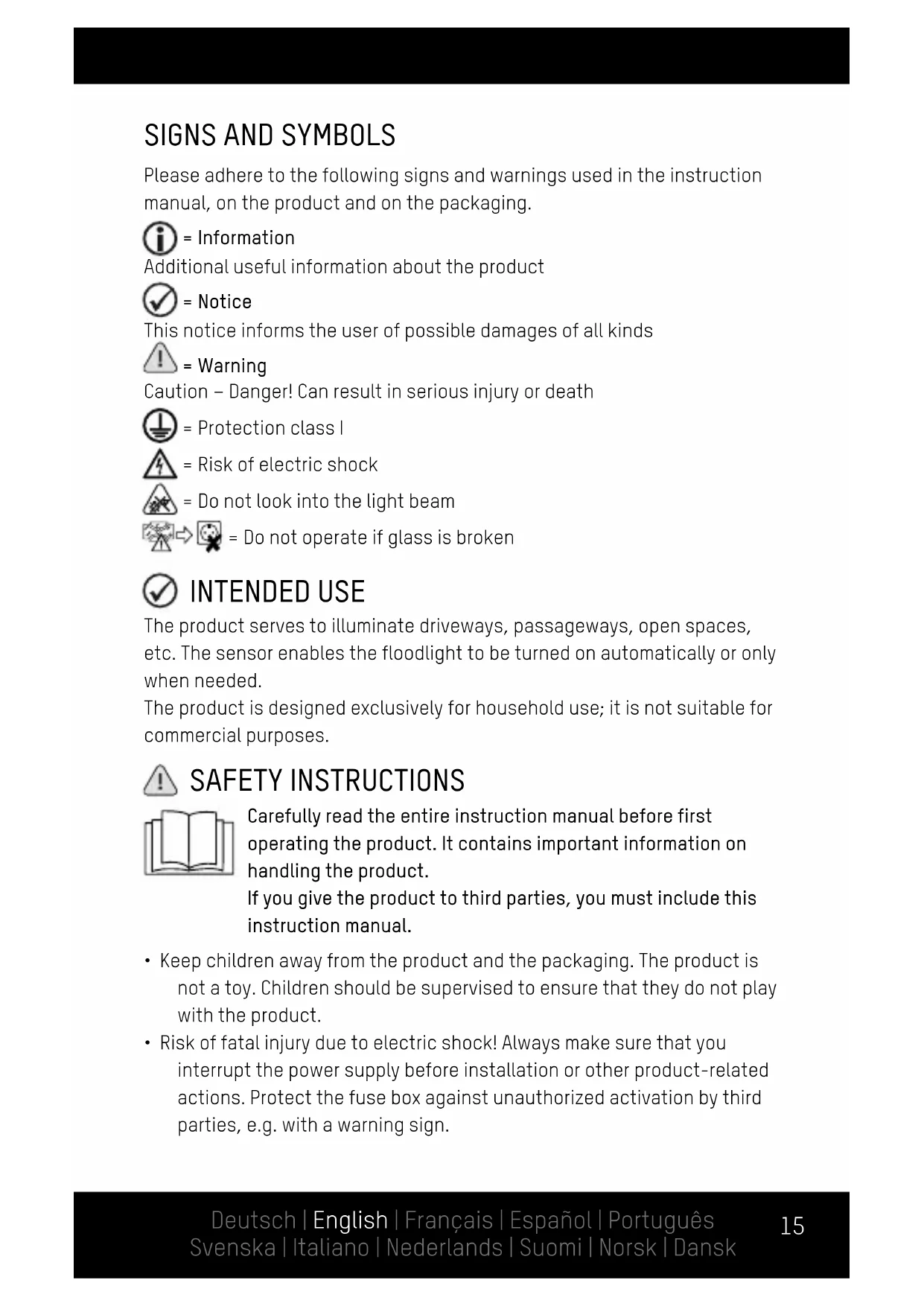 Please adhere to the following signs and warnings used in the instruction manual, on the product and on the packaging. = Information Additional useful information about the product = Notice This notice informs the user of possible damages of all kinds = Warning Caution – Danger! Can result in serious injury or death = Protection class I = Risk of electric shock = Do not look into the light beam = Do not operate if glass is broken INTENDED USE The product serves to illuminate driveways, passageways, open spaces, etc. The sensor enables the floodlight to be turned on automatically or only when needed. The product is designed exclusively for household use; it is not suitable for commercial purposes. SAFETY INSTRUCTIONS Carefully read the entire instruction manual before first operating the product. It contains important information on handling the product. If you give the product to third parties, you must include this instruction manual.