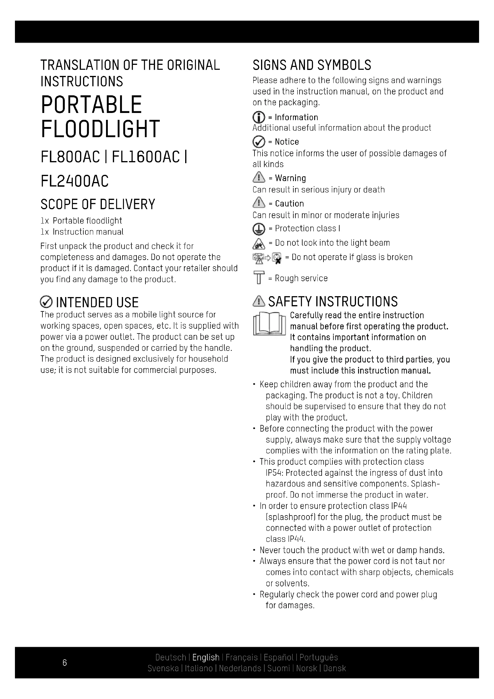 1x Portable floodlight 1x Instruction manual First unpack the product and check it for completeness and damages. Do not operate the product if it is damaged. Contact your retailer should you find any damage to the product. INTENDED USE The product serves as a mobile light source for working spaces, open spaces, etc. It is supplied with power via a power outlet. The product can be set up on the ground, suspended or carried by the handle. The product is designed exclusively for household use; it is not suitable for commercial purposes.