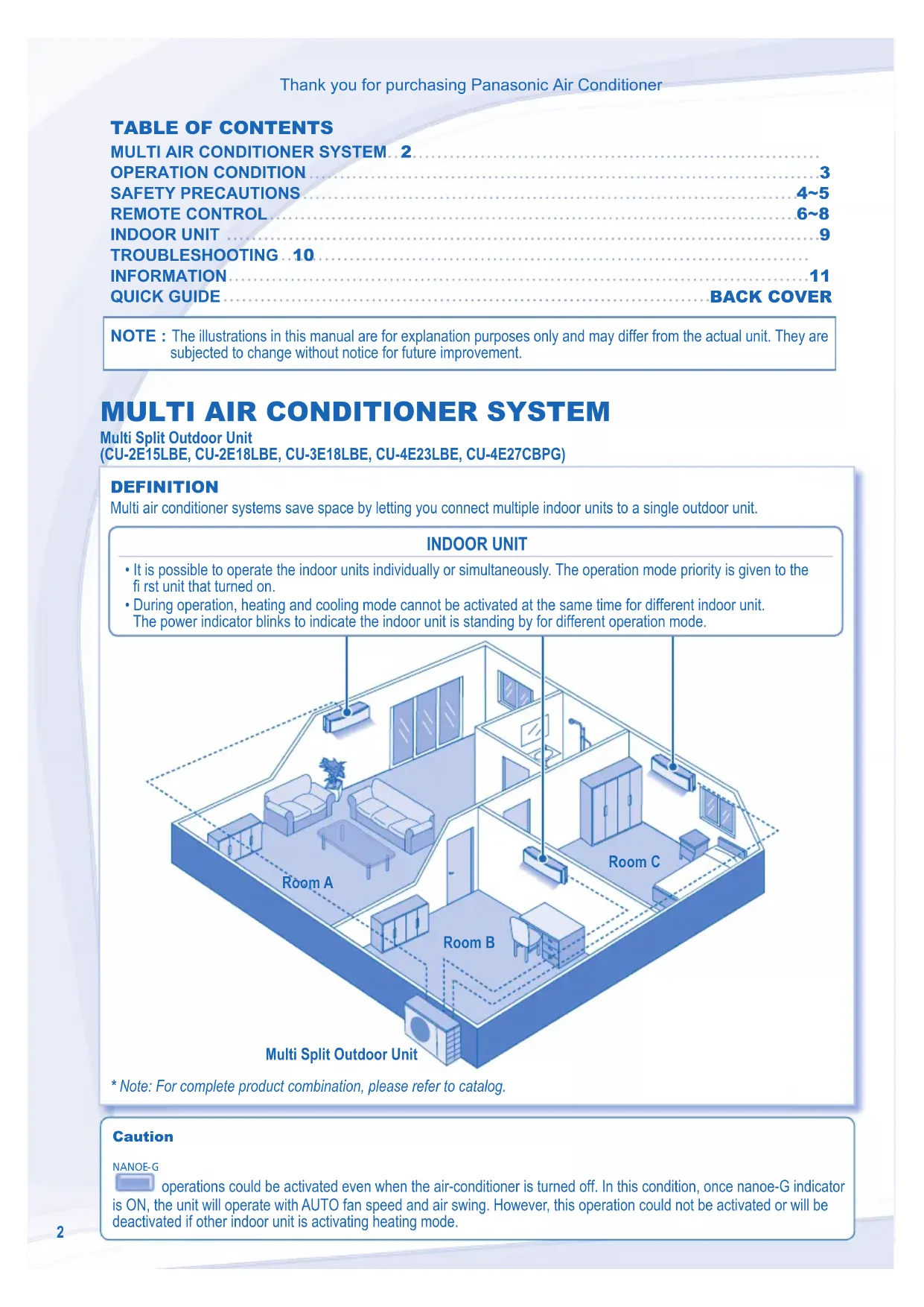 operations could be activated even when the air-conditioner is turned off. In this condition, once nanoe-G indicator is ON, the unit will operate with AUTO fan speed and air swing. However, this operation could not be activated or will be deactivated if other indoor unit is activating heating mode. DEFINITION Multi air conditioner systems save space by letting you connect multiple indoor units to a single outdoor unit. Room A Room A Room B Room B Room C Room C Multi Split Outdoor Unit Multi Split Outdoor Unit INDOOR UNIT INDOOR UNIT