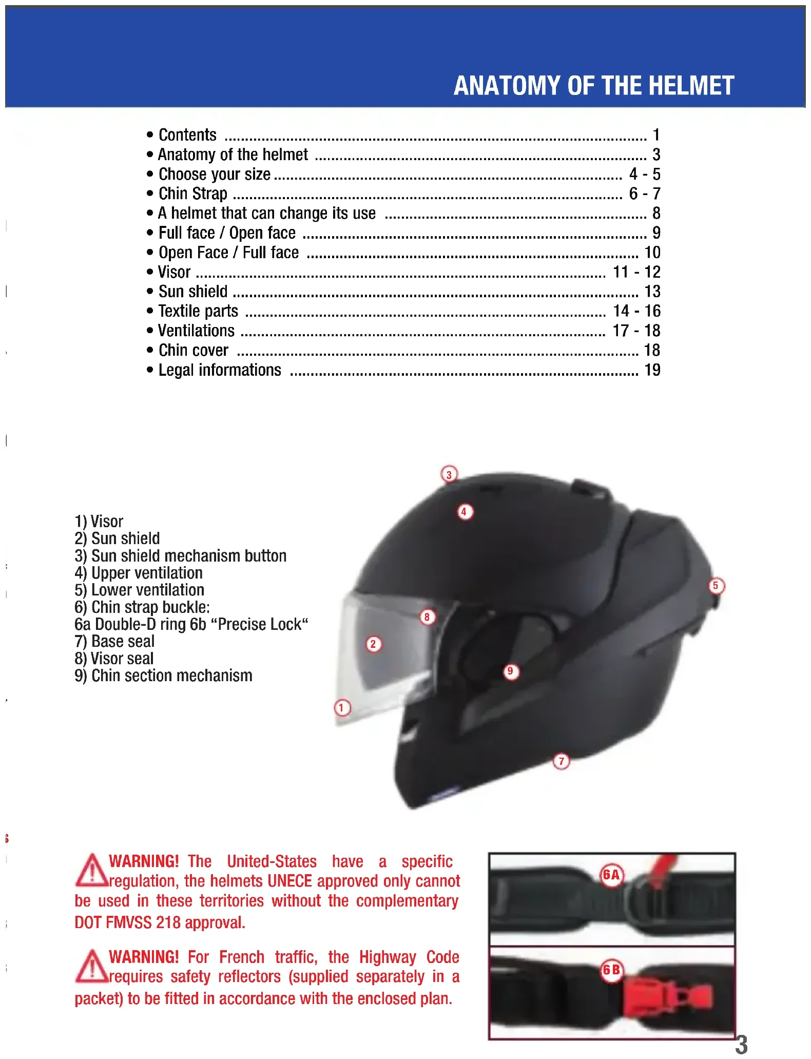 - Legal informations ..................................................................................... 19 WARNING! The United-States have a specific regulation, the helmets UNECE approved only cannot be used in these territories without the complementary DOT FMVSS 218 approval. WARNING! For French traffic, the Highway Code requires safety reflectors (supplied separately in a packet) to be fitted in accordance with the enclosed plan. leaning the never apours of these on the plug of The helmet may become seriously damaged by these chemical thus Only use mild lean and decals or adhesive tape onto These items may damage your thus your hearing will and both your field of vision and sure for this sensory Never ve around xample if your helmet is left on the passenger seat or in ar from heat sources, xhaust pipe or the top case. y question or comment regarding your