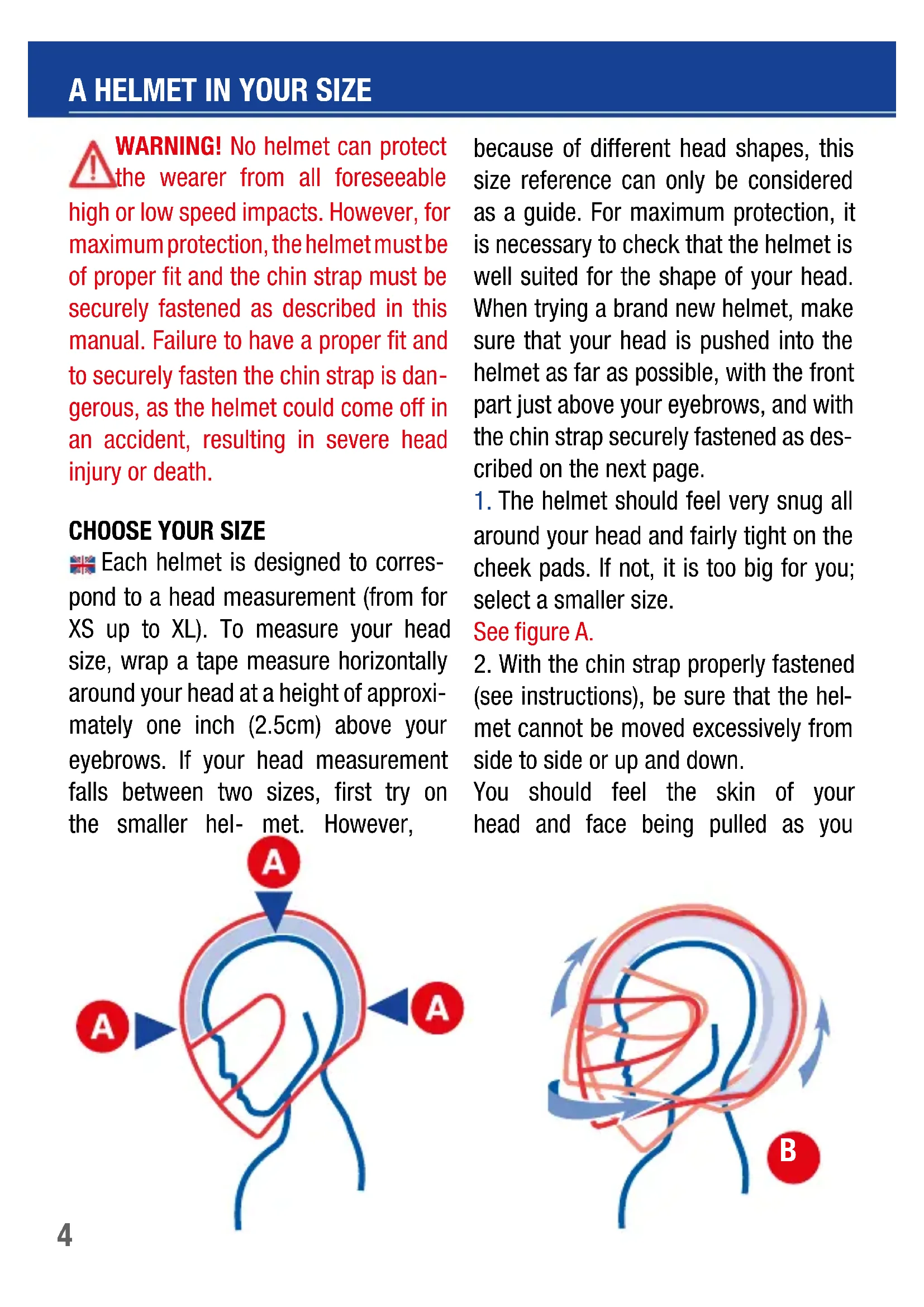 WARNING! No helmet can protect the wearer from all foreseeable high or low speed impacts. However, for maximum protection, the helmet must be of proper fit and the chin strap must be securely fastened as described in this manual. Failure to have a proper fit and to securely fasten the chin strap is dan