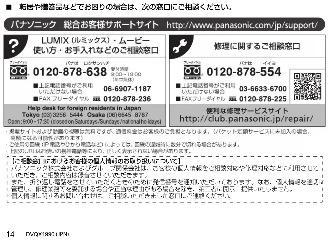 DAMAGES RESULTING FROM THE USE OF THIS PRODUCT OR ARISING OUT OF ANY BREACH OF ANY EXPRESS OR IMPLIED WARRANTY. (As examples, this warranty excludes damages for lost time, travel to and from the Authorized Servicer, loss of or damage to media or images, data or other memory or recorded content. This list of items is not exhaustive, but for illustration only.) In certain instances, some jurisdictions do not allow the exclusion or limitation of incidental or consequential damages, or the exclusion of implied warranties, so the above limitations and exclusions may not be applicable. This warranty gives you specific legal rights and you may have other rights which vary depending on your province or territory. WARRANTY SERVICE For product operation, repairs and information assistance, please visit our Support page: www.panasonic.ca/english/support For the U.S.A. Panasonic Corporation of North America Two Riverfront Plaza, Newark, NJ 07102-5490 http://shop.panasonic.com For CANADA Panasonic Canada Inc. 5770 Ambler Drive, Mississauga, Ontario L4W 2T3 www.panasonic.com Printed in Japan H-XA025-DVQX1990.book 26 ページ 2019年9月2日 月曜日 午後7時17分27 (ENG) DVQX1990 English Panasonic Warranty