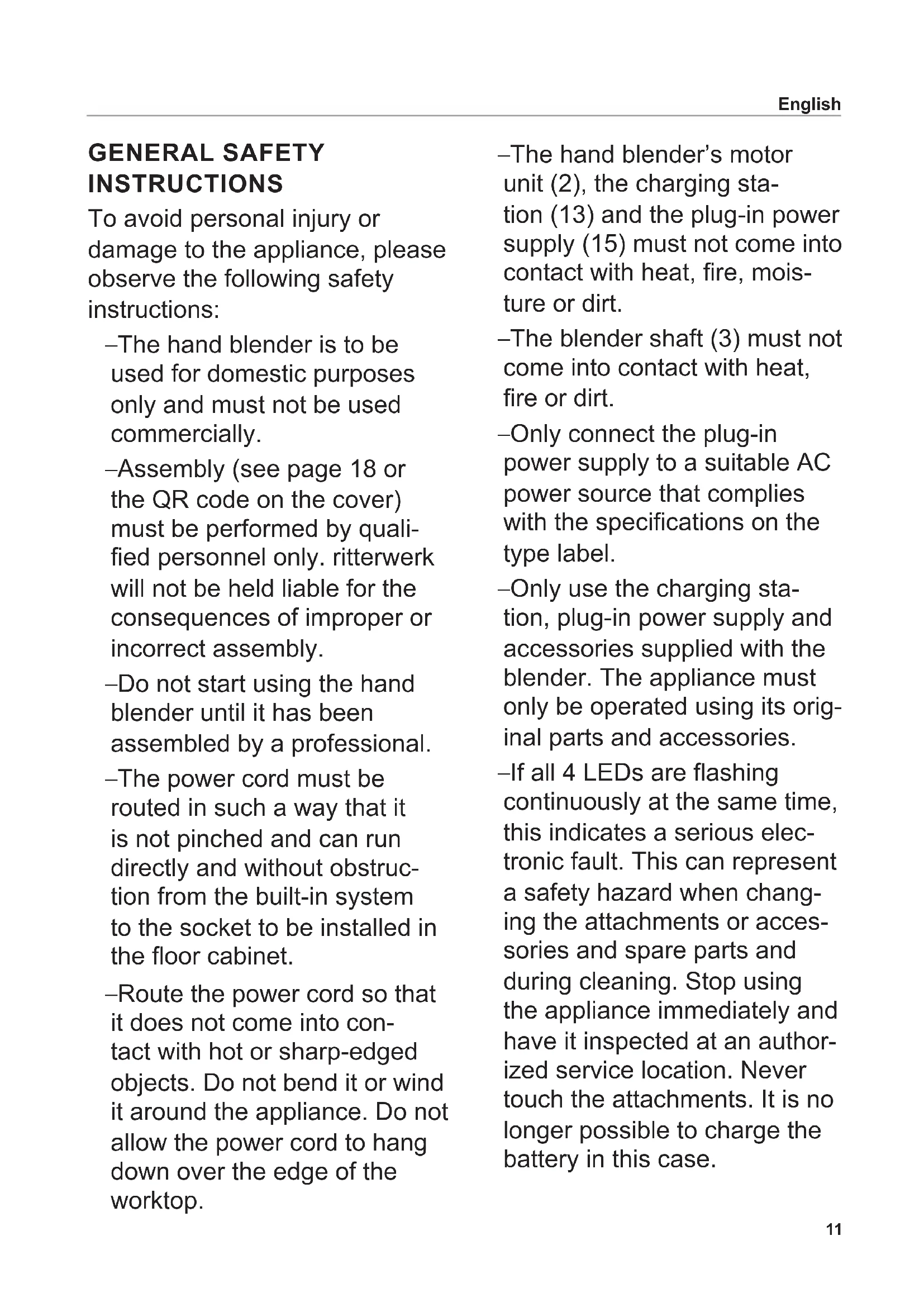 In der korrekten Position ist der Stabmixer fühlbar xiert und die LEDs der LED-Anzeige (6) blinken. Deutsch11 GENERAL SAFETY INSTRUCTIONS To avoid personal injury or damage to the appliance, please observe the following safety instructions: – The hand blender is to be used for domestic purposes only and must not be used commercially. – Assembly (see page 18 or the QR code on the cover) must be performed by quali- ed personnel only. ritterwerk will not be held liable for the consequences of improper or incorrect assembly. – Do not start using the hand blender until it has been assembled by a professional. – The power cord must be routed in such a way that it is not pinched and can run directly and without obstruc- tion from the built-in system to the socket to be installed in the oor cabinet. – Route the power cord so that it does not come into con- tact with hot or sharp-edged objects. Do not bend it or wind it around the appliance. Do not allow the power cord to hang down over the edge of the worktop. – The hand blender’s motor unit (2), the charging sta- tion (13) and the plug-in power supply (15) must not come into contact with heat, re, mois- ture or dirt. – The blender shaft (3) must not come into contact with heat, re or dirt. – Only connect the plug-in power supply to a suitable AC power source that complies with the specications on the type label. – Only use the charging sta- tion, plug-in power supply and accessories supplied with the blender. The appliance must only be operated using its orig- inal parts and accessories. – If all 4 LEDs are ashing continuously at the same time, this indicates a serious elec- tronic fault. This can represent a safety hazard when chang- ing the attachments or acces- sories and spare parts and during cleaning. Stop using the appliance immediately and have it inspected at an author- ized service location. Never touch the attachments. It is no longer possible to charge the battery in this case. English12 – This appliance must not be used by children. Keep the appliance and its connection cable out of reach of children. – Persons with reduced phys- ical, sensory or intellectual capabilities or lacking in relevant experience and/or knowledge may only use this appliance if they do so under supervision or have been instructed in the safe use of the appliance and understand the potential risks associated with its use. – Do not allow children to play with the appliance. – Do not start using the hand blender until it is positioned inside a at-bottomed container. – The hand blender must not be immersed in the food being blended above the level on the blender where the blender shaft meets the motor unit. – Never leave the appli- ance unattended while it is operating. – Never immerse the entire hand blender, charging sta- tion and plug-in power supply in water or any other liquid. Never expose the appliance to rain or any other form of mois- ture. If the appliance falls into water, rst unplug the charg- ing station's plug-in power supply from the mains socket before removing any of the appliance’s components from the water. Have the complete appliance inspected at an authorized service location before using it again. – Always ensure that your hands are completely dry before using the appliance. Do not use the appliance if it is wet or damp or while you are stand- ing on a damp surface. Do not use the appliance outdoors. – The hand blender and charg- ing station are not suitable for washing in a dishwasher. – Never touch any of the attach- ments while operating the hand blender and never insert any objects into the appliance while it is in use. English13 Risk of injury – Always remove the plug-in power supply from the socket in the event of a charging sta- tion malfunction. When doing so, pull on the plug and not on the cable. – To avoid the risk of personal injury, stop using the appliance immediately if any parts are damaged. Have the complete appliance inspected at an authorized service location before using it again. – If the plug-in power supply or the power cord is damaged, it must be replaced by an orig- inal plug-in power supply or power cord, which is available from the manufacturer or the manufacturer's national after- sales service. – Never switch the hand blender on when you are cleaning it, connecting or disconnect- ing its attachments or when replacing parts or accessories. Keep your ngers away from the buttons to prevent the appliance from switching on accidentally. Never touch the blades on the attachments, as these are very sharp. English – Food may splash out of the cup during processing. For this reason, allow hot food to cool before processing to avoid scalding. – If using the hand blender in a saucepan, remove the sauce- pan from the hot plate before processing. – Ensure that the slot on the attachment you are using is sitting squarely and rmly on the drive shaft pin. If attach- ments are loose or not rmly attached to the pin, they must not be used and must be replaced. Risk of explosion – Protect the battery from exposure to heat and re.14 Unfold the illustrations at the front and back of this manual. Please read these instructions thoroughly before you start to use the appliance. Keep these oper- ating instructions in a safe place and ensure that they are included with the appliance if passing it on to a third party. Alternatively, the current operat- ing instructions are available at www.ritterwerk.de. INTENDED USE The hand blender is used to purée, chop, whisk and mix suita- ble household foods. The hand blender is suitable for contact with foodstus. The hand blender is to be used for domestic purposes only and must not be used commercially. If the hand blender is used in a manner other than its intended use or if it is incorrectly operated, serious injuries may occur or the blender may be damaged. All warranty and liability claims will be rendered null and void in this case