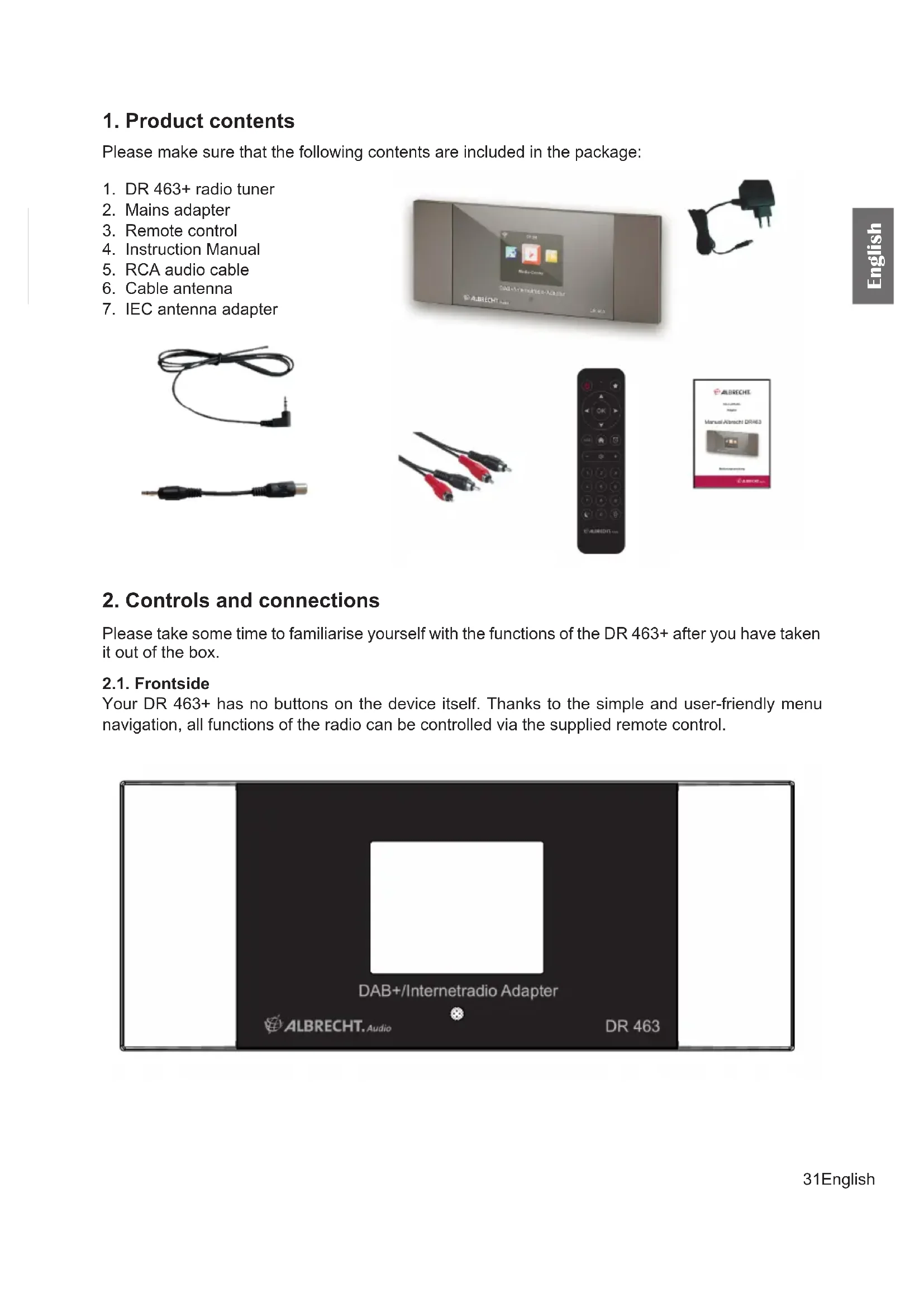 Please take some time to familiarise yourself with the functions of the DR 463+ after you have taken it out of the box. 2.1. Frontside Your DR 463+ has no buttons on the device itself. Thanks to the simple and user-friendly menu navigation, all functions of the radio can be controlled via the supplied remote control.32 English English 2.2. Backside The connections of this model are:v
