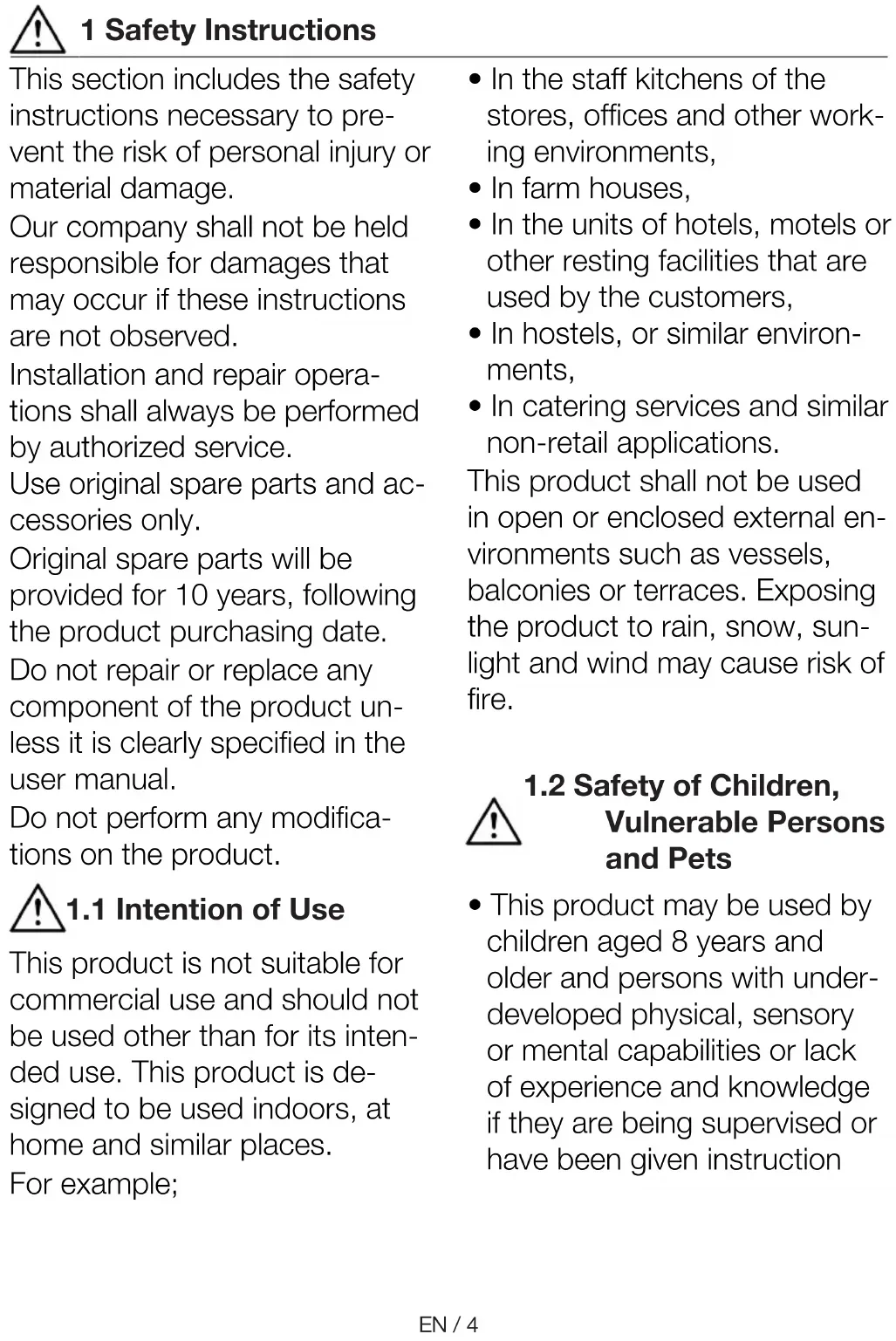 FREN / 4 1 Safety Instructions This section includes the safety instructions necessary to pre- vent the risk of personal injury or material damage. Our company shall not be held responsible for damages that may occur if these instructions are not observed. Installation and repair opera- tions shall always be performed by authorized service. Use original spare parts and ac- cessories only. Original spare parts will be provided for 10 years, following the product purchasing date. Do not repair or replace any component of the product un- less it is clearly specified in the user manual. Do not perform any modifica- tions on the product.