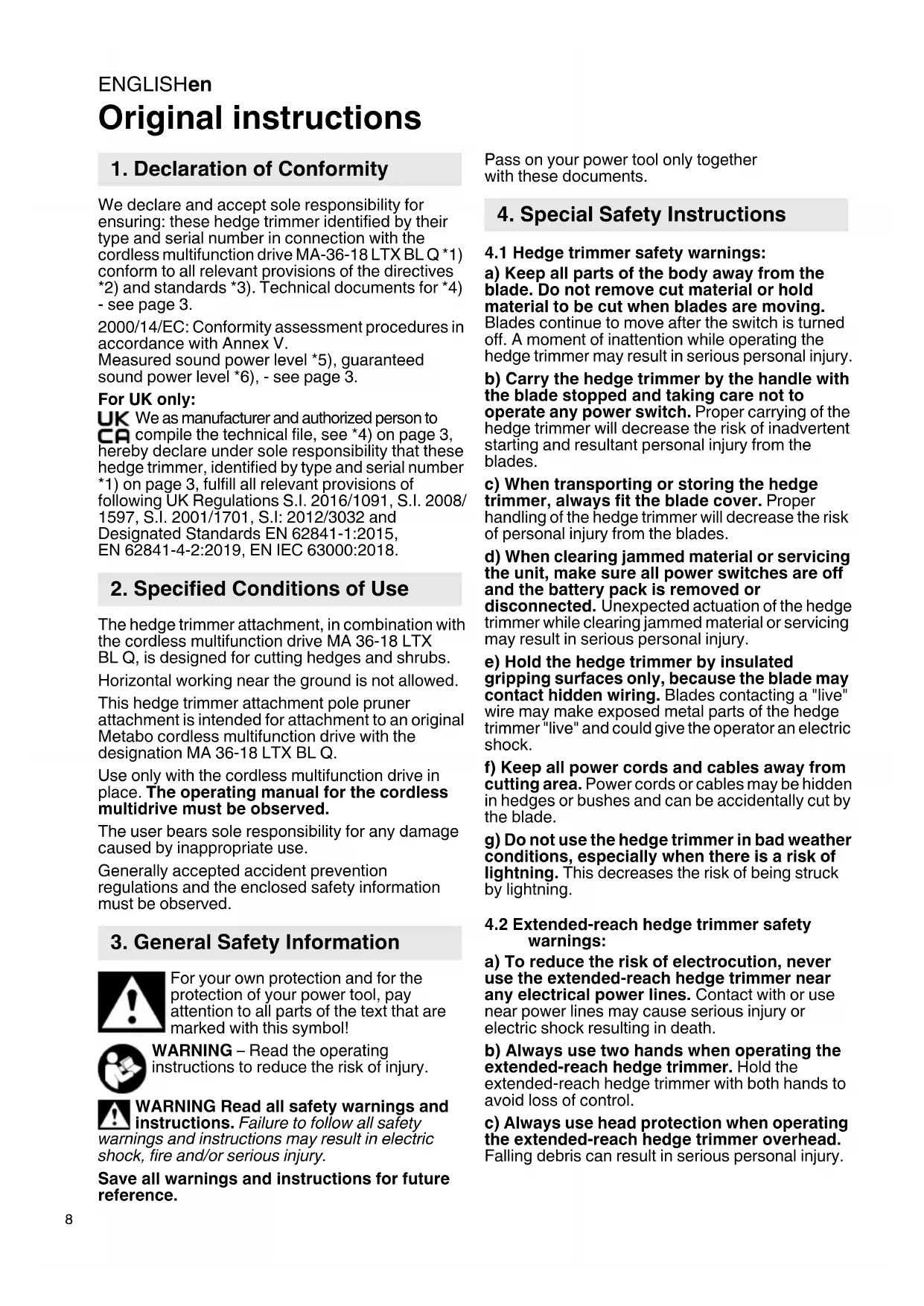 Original instructions We declare and accept sole responsibility for ensuring: these hedge trimmer identified by their type and serial number in connection with the cordless multifunction drive MA-36-18 LTX BL Q *1) conform to all relevant provisions of the directives *2) and standards *3). Technical documents for *4) - see page 3. 2000/14/EC: Conformity assessment procedures in accordance with Annex V. Measured sound power level *5), guaranteed sound power level *6), - see page 3. For UK only: We as manufacturer and authorized person to compile the technical file, see *4) on page 3, hereby declare under sole responsibility that these hedge trimmer, identified by type and serial number *1) on page 3, fulfill all relevant provisions of following UK Regulations S.I. 2016/1091, S.I. 2008/ 1597, S.I. 2001/1701, S.I: 2012/3032 and Designated Standards EN 62841-1:2015, EN 62841-4-2:2019, EN IEC 63000:2018. The hedge trimmer attachment, in combination with the cordless multifunction drive MA 36-18 LTX BL Q, is designed for cutting hedges and shrubs. Horizontal working near the ground is not allowed. This hedge trimmer attachment pole pruner attachment is intended for attachment to an original Metabo cordless multifunction drive with the designation MA 36-18 LTX BL Q. Use only with the cordless multifunction drive in place. The operating manual for the cordless multidrive must be observed. The user bears sole responsibility for any damage caused by inappropriate use. Generally accepted accident prevention regulations and the enclosed safety information must be observed. For your own protection and for the protection of your power tool, pay attention to all parts of the text that are marked with this symbol! WARNING – Read the operating instructions to reduce the risk of injury. WARNING Read all safety warnings and instructions. Failure to follow all safety warnings and instructions may result in electric shock, fire and/or serious injury. Save all warnings and instructions for future reference. Pass on your power tool only together with these documents.