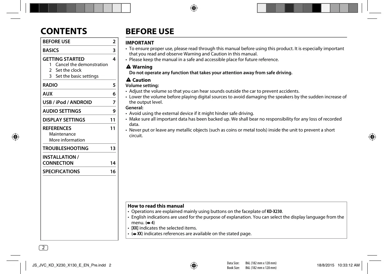 *1 Do not leave the cable inside the car when not using. *2 When connecting an Android device, “Press [VIEW] to install JVC MUSIC PLAY APP” is shown. Follow the instructions to install the application. You can also install the latest version of JVC MUSIC PLAY application on your Android device before connecting. ( 11) *3 For ANDROID: Applicable only when [AUTO MODE] is selected. ( 8) *4 Only for MP3/WMA/WAV/FLAC files. This does not work for iPod/ ANDROID. *5 For iPod/ ANDROID: Applicable only when [HEAD MODE]/ [AUTO MODE] is selected. ( 8) ENGLISH JS_JVC_KD_X230_X130_E_EN_Pre.indd 7 Data Size: Book Size: B6L (182 mm x 128 mm) B6L (182 mm x 128 mm)