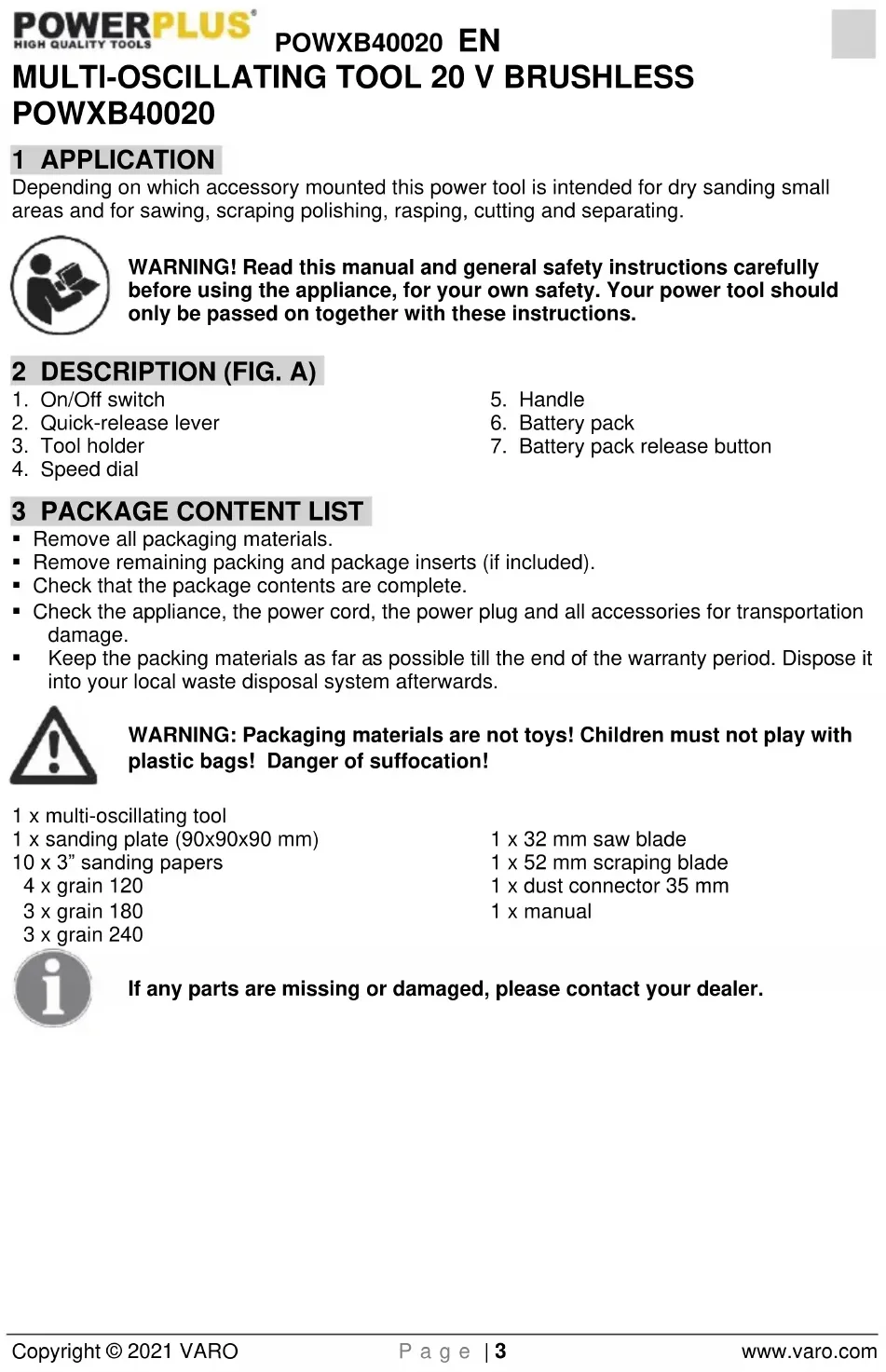 VARO – Vic. Van Rompuy N.V. - Joseph Van Instraat 9 - BE2500 Lier - BELGIUM, declares that, Product: Multi-Oscillating tool – Battery operated Trade mark: PowerPlus Model: POWXB40020 is in conformity with the essential requirements and other relevant provisions of the applicable European Directives, based on the application of European harmonized standards. Any unauthorized modification of the apparatus voids this declaration. European Directives (including, if applicable, their amendments up to the date of signature): 2011/65/EU 2014/30/EU 2006/42/EC European harmonized standards (including, if applicable, their amendments up to the date of signature): EN62841-1: 2015 EN62841-2-4 : 2014 EN55014-1 : 2017 EN55014-2 : 2015 Keeper of the Technical Documentation: Philippe Vankerkhove, VARO – Vic. Van Rompuy N.V. The undersigned acts on behalf of the company CEO, Philippe Vankerkhove Certification Manager 21/01/2021, Lier - BelgiumPOWXB40020 DE Copyright © 2021 VARO Seite | 1 www.varo.com 1 EINSATZBEREICH ......................................................................... 3