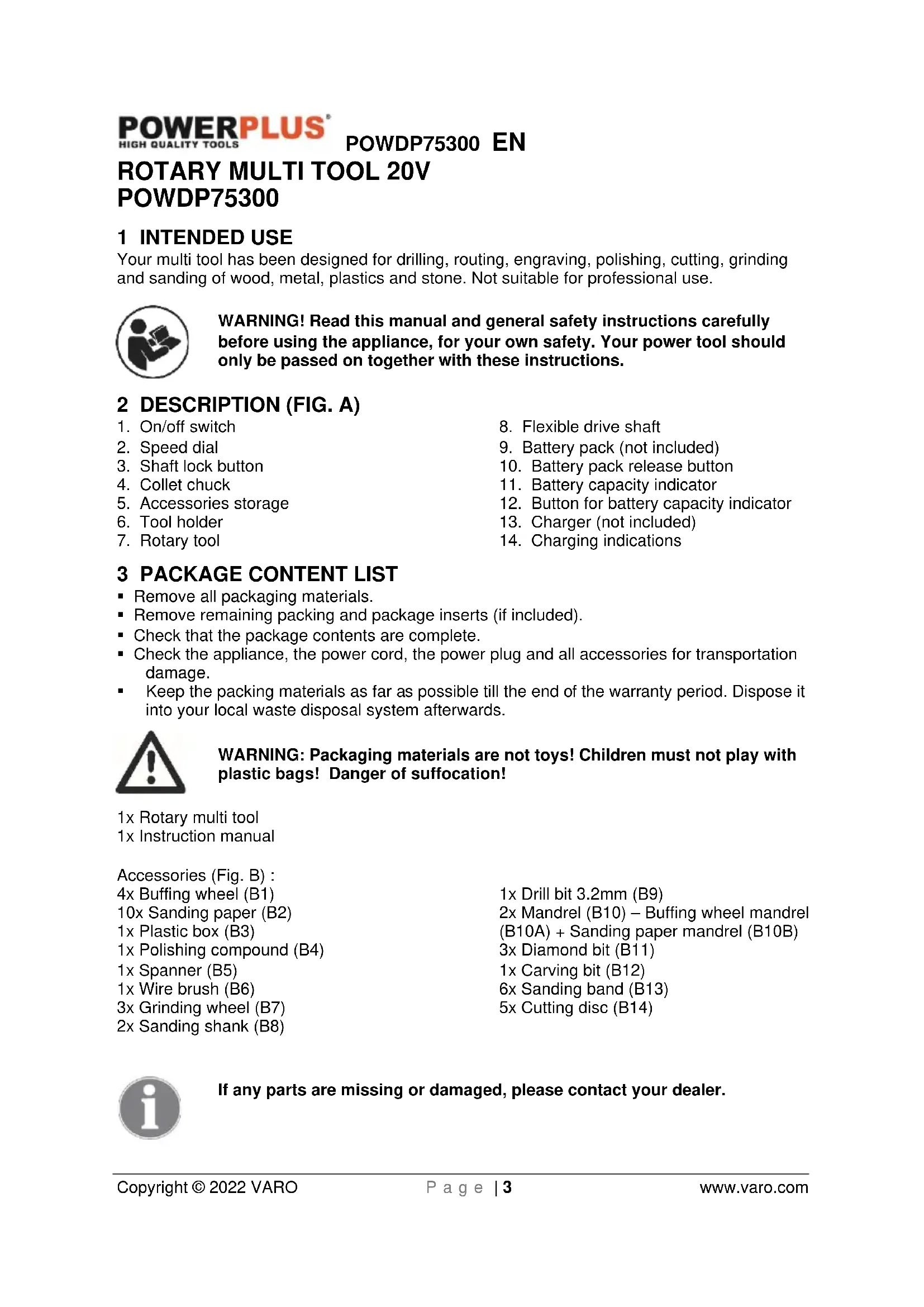 plastic bags! Danger of suffocation! 1x Rotary multi tool 1x Instruction manual Accessories (Fig. B) : 4x Buffing wheel (B1) 10x Sanding paper (B2) 1x Plastic box (B3) 1x Polishing compound (B4) 1x Spanner (B5) 1x Wire brush (B6) 3x Grinding wheel (B7) 2x Sanding shank (B8) 1x Drill bit 3.2mm (B9) 2x Mandrel (B10) – Buffing wheel mandrel (B10A) + Sanding paper mandrel (B10B) 3x Diamond bit (B11) 1x Carving bit (B12) 6x Sanding band (B13) 5x Cutting disc (B14) If any parts are missing or damaged, please contact your dealer.POWDP75300 EN Copyright © 2022 VARO P a g e | 4 www.varo.com 4 SYMBOLS In this manual and/or on the machine the following symbols are used: