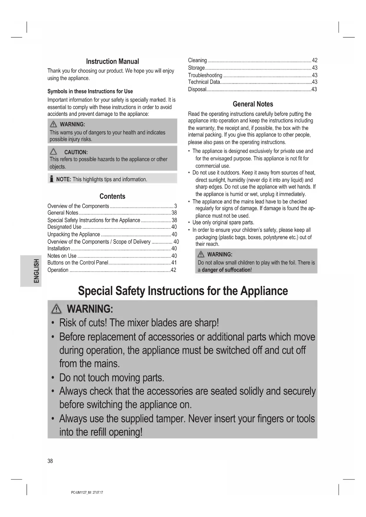 - Do not remove the mixing container during operation! Pause the operation with the button START / STOP or ON / OFF and wait until the blades come to an absolute stop. Then you may remove the mixing vessel.41 PC-UM1127_IM 27.07.17 ProtectiveFeatures The appliance is equipped with safety switches. The appli- ance can only be operated if the following is observed: