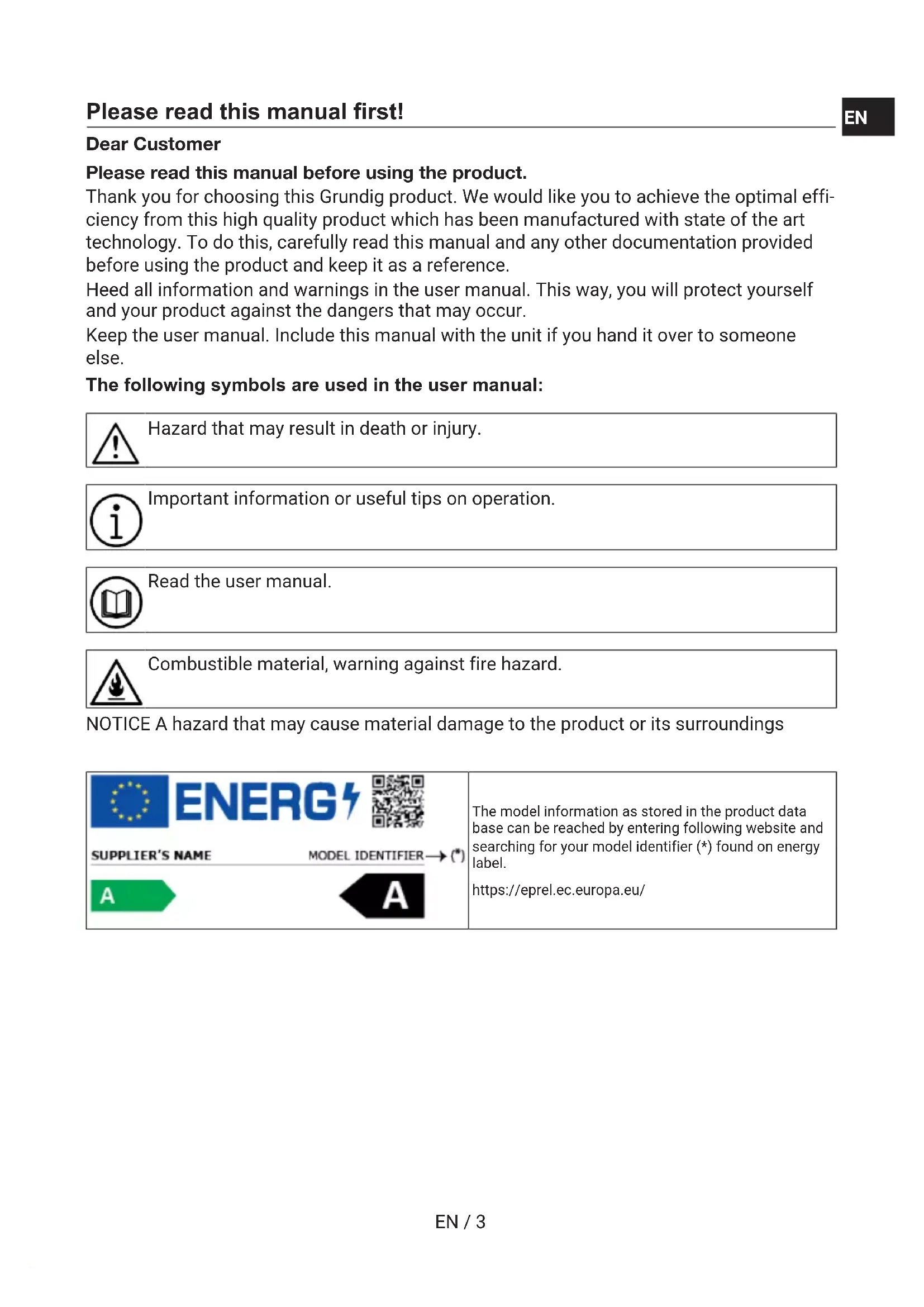 10 Maintenance and Cleaning .......... 24 11 Troubleshooting ............................ 25EN / 3 Please read this manual first! Dear Customer Please read this manual before using the product. Thank you for choosing this Grundig product. We would like you to achieve the optimal effi- ciency from this high quality product which has been manufactured with state of the art technology. To do this, carefully read this manual and any other documentation provided before using the product and keep it as a reference. Heed all information and warnings in the user manual. This way, you will protect yourself and your product against the dangers that may occur. Keep the user manual. Include this manual with the unit if you hand it over to someone else. The following symbols are used in the user manual: Hazard that may result in death or injury. Important information or useful tips on operation. Read the user manual. Combustible material, warning against fire hazard. NOTICE A hazard that may cause material damage to the product or its surroundings The model information as stored in the product data base can be reached by entering following website and searching for your model identifier (*) found on energy label. https://eprel.ec.europa.eu/