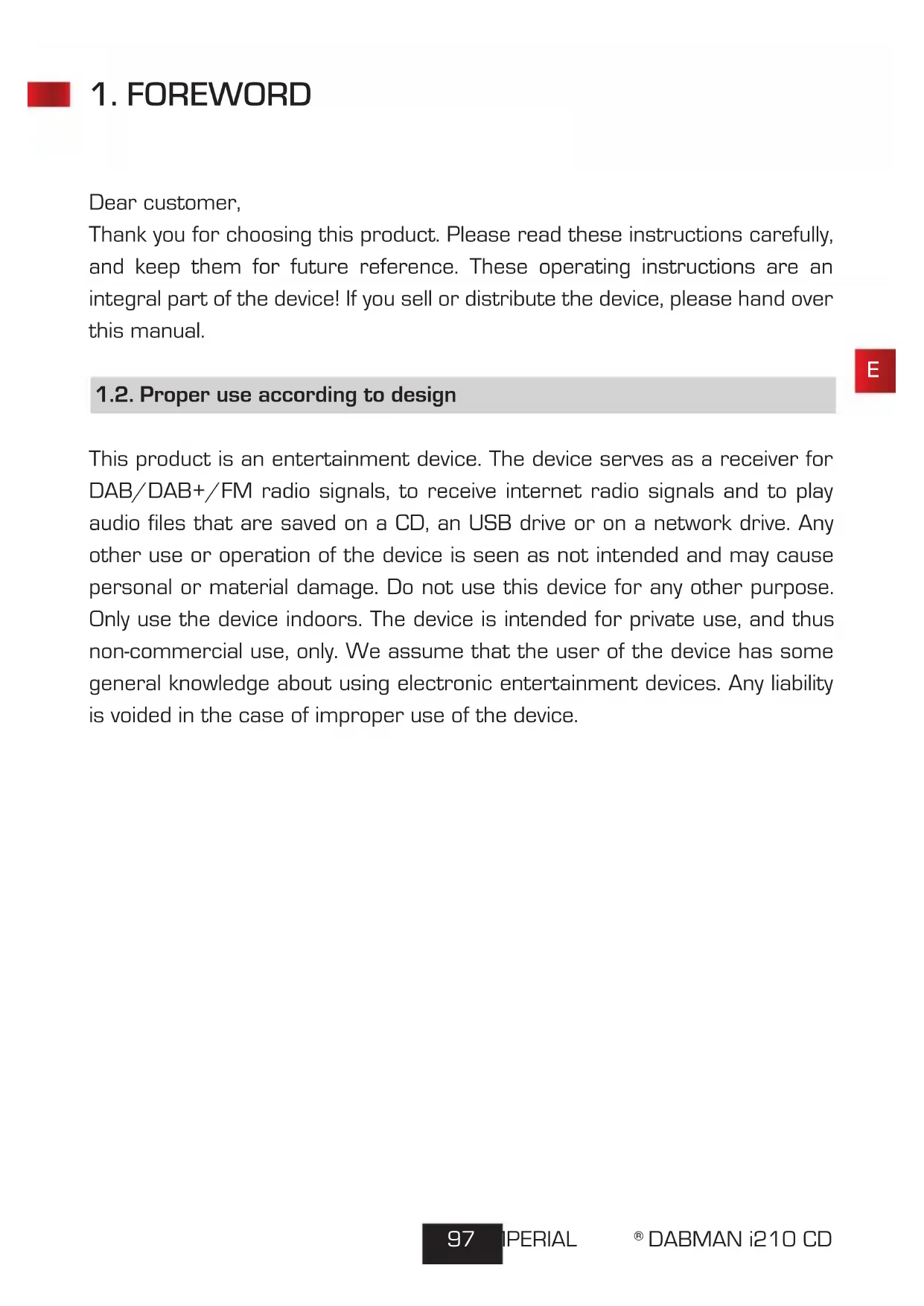 Dear customer, Thank you for choosing this product. Please read these instructions carefully, and keep them for future reference. These operating instructions are an integral part of the device! If you sell or distribute the device, please hand over this manual. 1.2. Proper use according to design This product is an entertainment device. The device serves as a receiver for DAB/DAB+/FM radio signals, to receive internet radio signals and to play audio files that are saved on a CD, an USB drive or on a network drive. Any other use or operation of the device is seen as not intended and may cause personal or material damage. Do not use this device for any other purpose. Only use the device indoors. The device is intended for private use, and thus non-commercial use, only. We assume that the user of the device has some general knowledge about using electronic entertainment devices. Any liability is voided in the case of improper use of the device.E 98Operating Manual 2.1. Explanation of symbols SYMBOL EXPLANATION This signal word describes a hazard with a high level of risk, that may lead to death or severe injury if not followed. This signal word describes a hazard with a medium level of risk, that may lead to death or severe injury if not properly followed. This signal word describes a hazard with a low level of risk, that may lead to minor or moderate injuries if not properly followed. This signal word warns against possible material damages and indicates specific instructions to operate the device. This sign warns against danger.