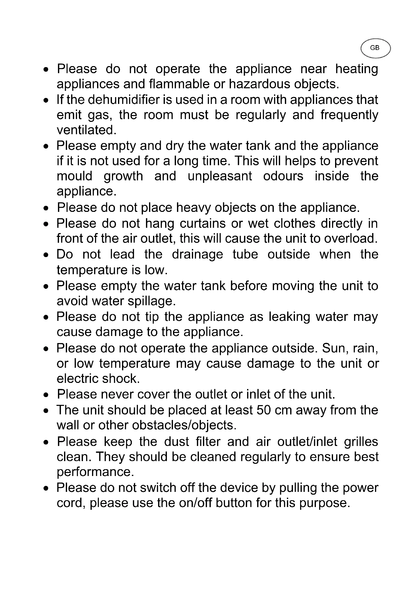 - Please press and hold the humidity level button (6) for 3 seconds to start continuous dehumidification. Cleaning and maintenance To avoid injuries, please switch off and unplug the appliance before starting service or cleaning. Cleaning: