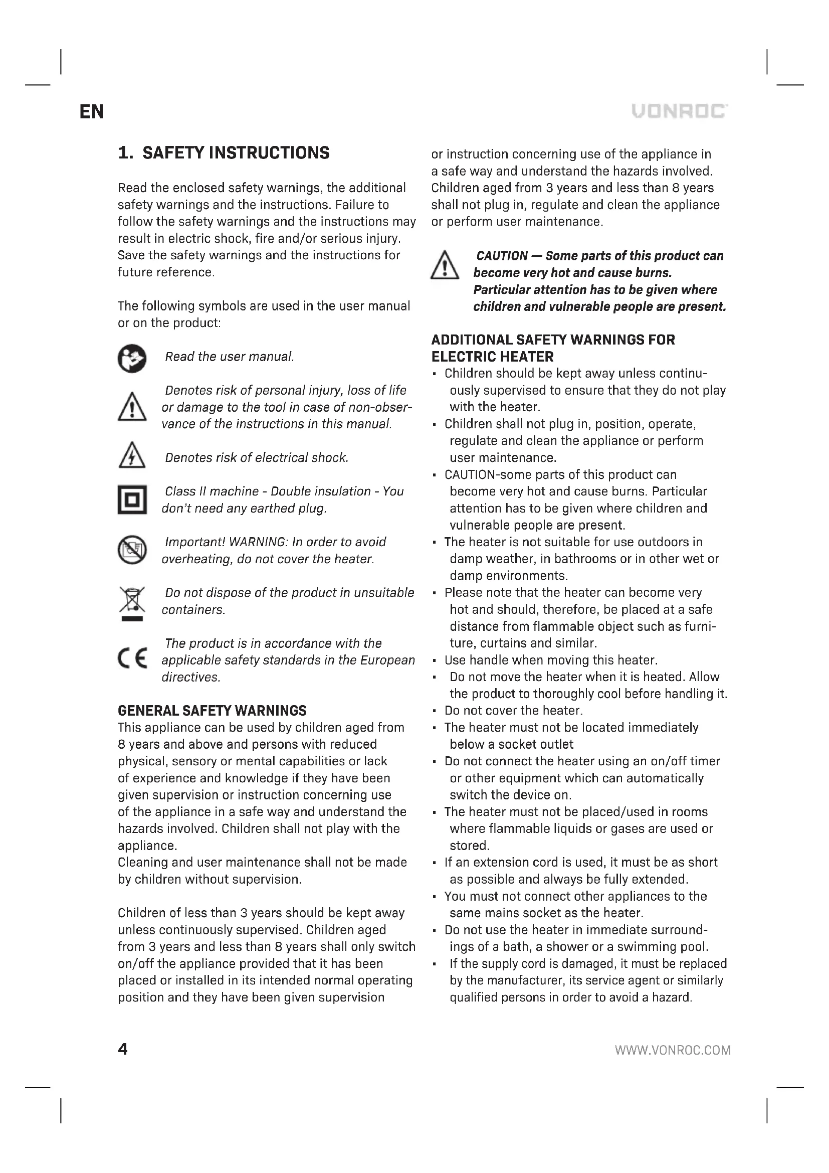 - When you store the heater, let it cool down first and, keep it dry. Trouble shooting In case the electric heater does not work well, we give you subjoined some possible causes and their solutions. Problem Possible cause Solution The heater does not operate, even when it is plugged in and the switch, thermostat are switched on. The plug is loose, bad connection Pull out the plug, check the connection of the plug and socket. Then connect again. No power in socket outlet Insert the plug in aproper socket Tip-over protection Put the heater on afirm and level surface. Overheat protection Unplug the heater and wait at least 30 minutes to cool down before restarting the heater. The heating element glowing The input voltage is too high or too low Use power supply according to the rating on the label The air inlet (3) grill is blocked Keep the heater far way from articles like curtain, plastic bag, paper and other things which can cover the inlet or can be easily cover on the air inlet Problem Possible cause Solution The appliance didn’t heat up, only ventilator worked The switch was not put at heating setting Turn the switch to heat setting The thermostat operated Turn the thermostat and listen if there is open/close voice. If there is no click and the thermostat is not damaged, the heater will automatic switch on when the appliance cooled down The self-retting cut-out operated Turn the heater off and inspect the blockage of inlet or outlet. Disconnect the plug and wait at least 10 minutes for the protection system to reset before attempting to restart the heater. Abnormal noise The appliance is not stands upright Put the heater on alevel surface ENVIRONMENT Faulty and/or discarded electrical or electronic apparatus have to be collected at the appropriate recycling locations. Only for EC countries Do not dispose of power tools into domestic waste. According to the European Guideline 2012/19/ EU for Waste Electrical and Electronic Equipment and its implementation into national right, power tools that are no longer usable must be collected separately and disposed of in an environmentally friendly way. WARRANTY VONROC products are developed to the highest quality standards and are guaranteed free of defects in both materials and workmanship for the period lawfully stipulated starting from the date of original purchase. Should the product develop any failure during this period due to defective material and/or workmanship then contact VONROC directly. The following circumstances are excluded from this guarantee: