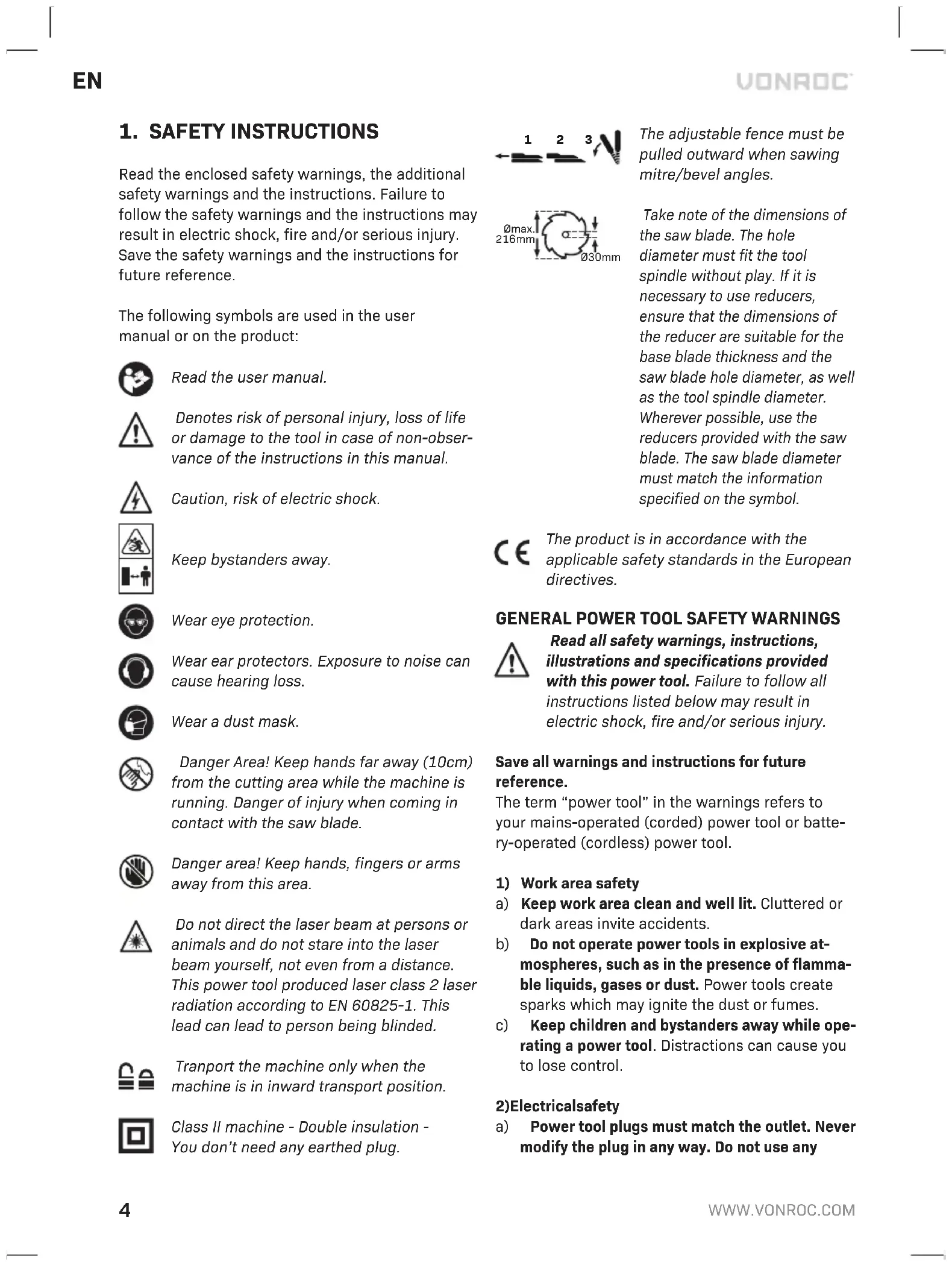 The adjustable fence must be pulled outward when sawing mitre/bevel angles. Ø30mm Ømax. 216mm Take note of the dimensions of the saw blade. The hole diameter must fit the tool spindle without play. If it is necessary to use reducers, ensure that the dimensions of the reducer are suitable for the base blade thickness and the saw blade hole diameter, as well as the tool spindle diameter. Wherever possible, use the reducers provided with the saw blade. The saw blade diameter must match the information specified on the symbol. The product is in accordance with the applicable safety standards in the European directives.