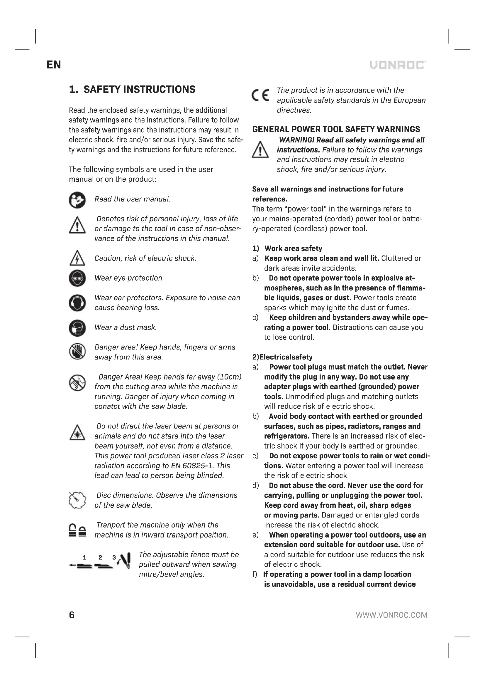 - Move the mitre saw forwards and backwards so the oil spreads over the complete rails. ENVIRONMENT Faulty and/or discarded electrical or electronic apparatus have to be collected at the appropriate recycling locations. Only for EC countries Do not dispose of power tools into domestic waste. According to the European Guideline 2012/19/EU for Waste Electrical and Electronic Equipment and its implementation into national right, power tools that are no longer usable must be collected separately and disposed of in an environmentally friendly way. WARRANTY VONROC products are developed to the highest quality standards and are guaranteed free of defects in both materials and workmanship for the period lawfully stipulated starting from the date of original purchase. Should the product develop any failure during this period due to defective material and/or workmanship then contact your VONROC directly. The following circumstances are excluded from this guarantee: