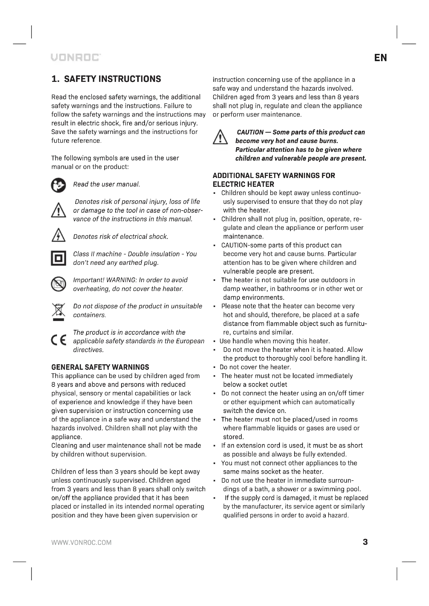 Trouble shooting In case the electric heater does not work well, we give you subjoined some possible causes and their solutions. Problem Possible cause Treatment The heater does not operate, even when it is plugged in and the switch, thermostat are switched on. The plug is loose, bad connection Pull out the plug, check the connection of the plug and socket. Then connect again. No power in socket outlet Insert the plug in a proper socket The heating element glowing The input voltage is too high or too low Use power supply according to the rating on the label The air inlet grill is blocked Keep the heater far way from articles like curtain, plastic bag, paper and other things which can cover the inlet or can be easily cover on the air inlet The appliance didn’t heat up, only ventilator worked The switch was not put at heating setting Turn the switch to heat setting The thermostat operated Turn the thermostat and listen if there is open/close voice. If there is no click and the thermostat is not damaged, the heater will automatic switch on when the appliance cooled down The self-retting cut-out operated Turn the heater off and inspect the blockage of inlet or outlet. Disconnect the plug and wait at least 10 minutes for the protection system to reset before attempting to restart the heater. Abnormal noise The appliance is not stands upright Put the heater on a level surface ENVIRONMENT Faulty and/or discarded electrical or electronic apparatus have to be collected at the appropriate recycling locations. Only for EC countries Do not dispose of power tools into domestic waste. According to the European Guideline 2012/19/EU for Waste Electrical and Electronic Equipment and its implementation into national right, power tools that are no longer usable must be collected separately and disposed of in an environmentally friendly way. WARRANTY VONROC products are developed to the highest quality standards and are guaranteed free of defects in both materials and workmanship for the period lawfully stipulated starting from the date of original purchase. Should the product develop any failure during this period due to defective material and/or workmanship then contact VONROC directly. The following circumstances are excluded from this guarantee: