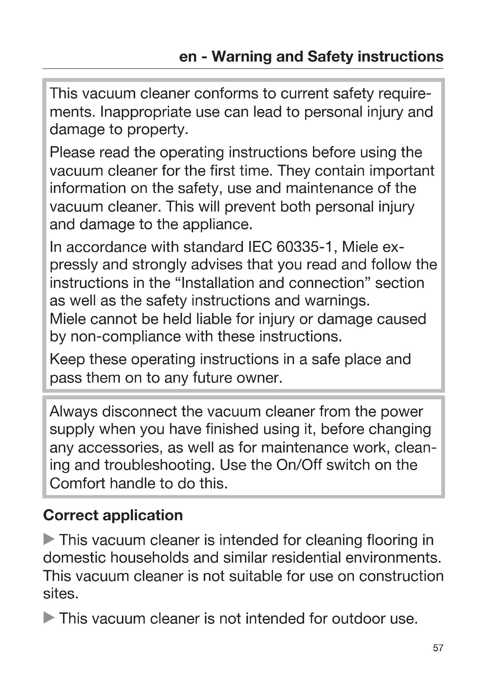 This vacuum cleaner conforms to current safety require- ments. Inappropriate use can lead to personal injury and damage to property. Please read the operating instructions before using the vacuum cleaner for the first time. They contain important information on the safety, use and maintenance of the vacuum cleaner. This will prevent both personal injury and damage to the appliance. In accordance with standard IEC60335-1, Miele ex- pressly and strongly advises that you read and follow the instructions in the “Installation and connection” section as well as the safety instructions and warnings. Miele cannot be held liable for injury or damage caused by non-compliance with these instructions. Keep these operating instructions in a safe place and pass them on to any future owner. Always disconnect the vacuum cleaner from the power supply when you have finished using it, before changing any accessories, as well as for maintenance work, clean- ing and troubleshooting. Use the On/Off switch on the Comforthandle to do this. Correct application This vacuum cleaner is intended for cleaning flooring in domestic households and similar residential environments. This vacuum cleaner is not suitable for use on construction sites. This vacuum cleaner is not intended for outdoor use.en - Warning and Safety instructions