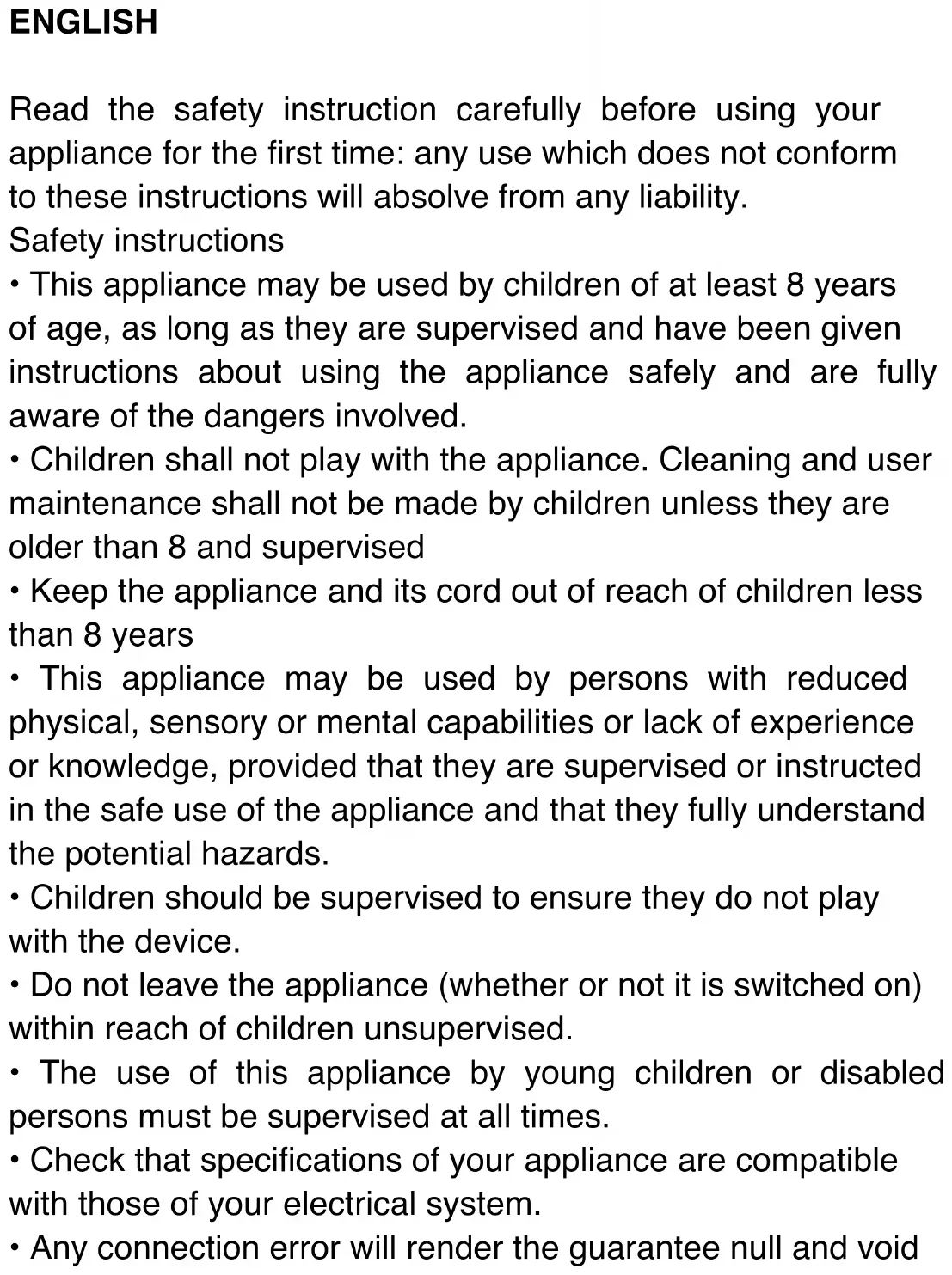 gfx8001 ENGLISH Read the safety instruction carefully before using your appliance for the first time: any use which does not conform to these instructions will absolve from any liability. Safety instructions