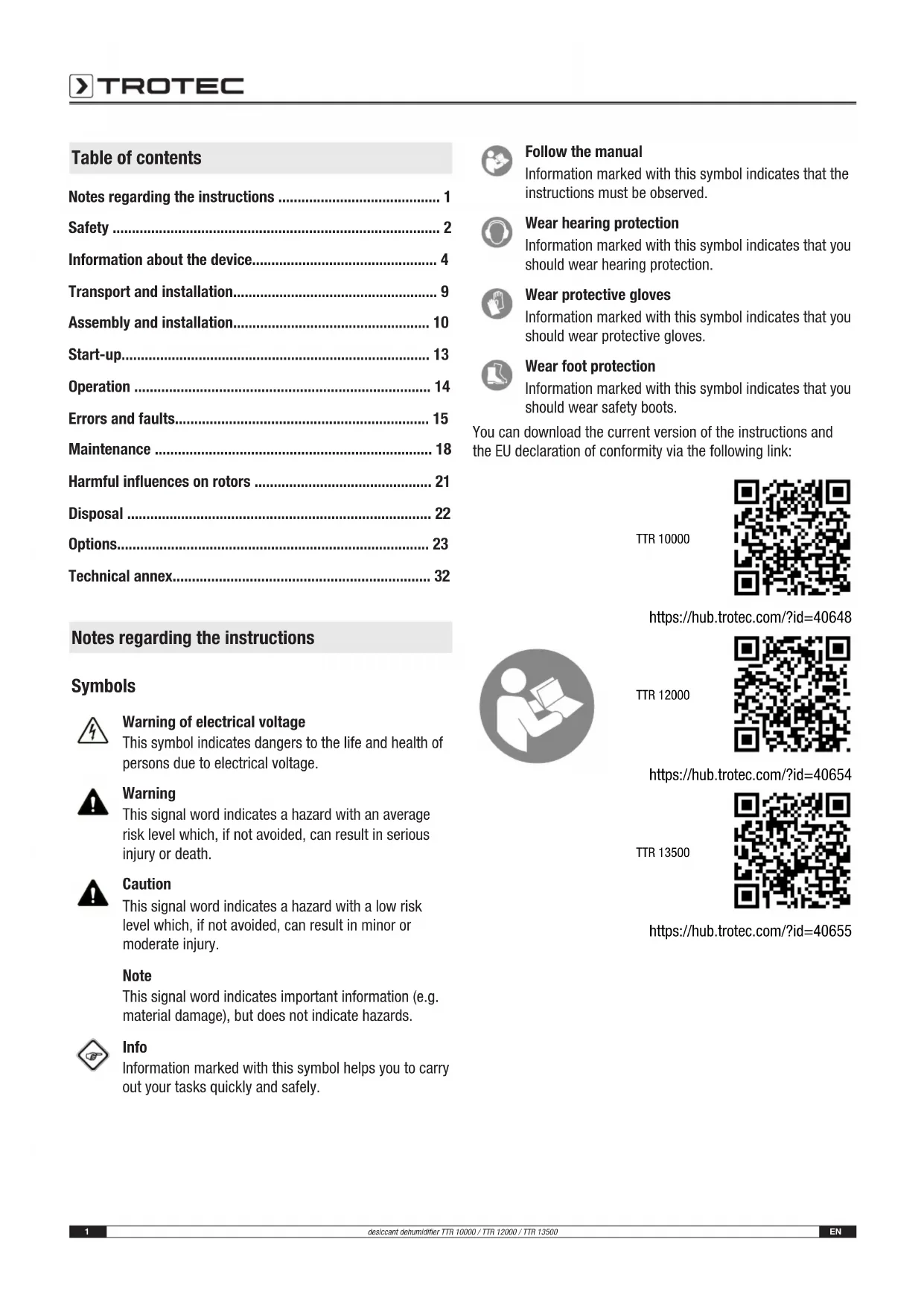 - Technical annex Notes regarding the instructions Symbols Warning of electrical voltage This symbol indicates dangers to the life and health of persons due to electrical voltage. Warning This signal word indicates a hazard with an average risk level which, if not avoided, can result in serious injury or death. Caution This signal word indicates a hazard with a low risk level which, if not avoided, can result in minor or moderate injury. Note This signal word indicates important information (e.g. material damage), but does not indicate hazards. Info Information marked with this symbol helps you to carry out your tasks quickly and safely. Follow the manual Information marked with this symbol indicates that the instructions must be observed. Wear hearing protection Information marked with this symbol indicates that you should wear hearing protection. Wear protective gloves Information marked with this symbol indicates that you should wear protective gloves. Wear foot protection Information marked with this symbol indicates that you should wear safety boots. You can download the current version of the instructions and the EUdeclaration of conformity via the following link: TTR 10000 https://hub.trotec.com/?id=40648 TTR 12000 https://hub.trotec.com/?id=40654 TTR 13500 https://hub.trotec.com/?id=40655EN 2 desiccant dehumidifier TTR 10000 / TTR 12000 / TTR 13500 Safety Read this manual carefully before starting or using the device. Always store the manual in the immediate vicinity of the device or its site of use! Warning Read all safety warnings and all instructions. Failure to follow the warnings and instructions may result in electric shock, fire and/ or serious injury. Save all warnings and instructions for future reference. p. 32