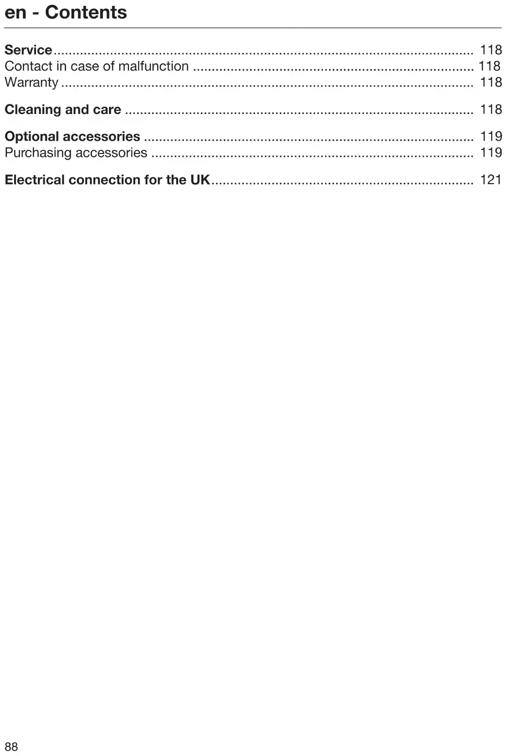 Service Information to help you rectify faults yourself and about Miele spare parts can be found at www.miele.com/ser- vice. Contact in case of malfunction In the event of any faults which you cannot remedy yourself, please contact your Miele Dealer or Miele Service. Contact information for Miele Service can be found at the end of this docu- ment. Please note that telephone calls may be monitored and recorded for training purposes and that a call-out charge will be applied to service visits where the problem could have been resolved as described in this booklet. Warranty For information on the appliance war- ranty specific to your country please contact Miele. See back cover for ad- dress. In the UK, your appliance warranty is valid for 2 years from the date of pur- chase. However, you must activate your cover by calling 0330 160 6640 or re- gistering online at www.miele.co.uk. Cleaning and care Risk of injury caused by rotating roller brush. You can injure yourself on the rotat- ing roller brush. Always switch the vacuum cleaner off before cleaning it. Use the On/Off switch on the Comfort handle to do this. Vacuum cleaner and accessories Risk of electric shock from mains voltage. If moisture gets into the charger, there is a risk of electric shock. Do not let the charger get wet. Follow the special cleaning instruc- tions for the dust container in the “Maintenance” section. The vacuum cleaner and all plastic ac- cessories should be cleaned with a commercially available cleaner suitable for plastic. Damage due to unsuitable clean- ing agents. All surfaces are susceptible to scratching. Contact with unsuitable cleaning agents can alter or discol- our all surfaces. Do not use abrasive cleaning agents, glass cleaning agents, all-purpose cleaners or oil-based care products.en