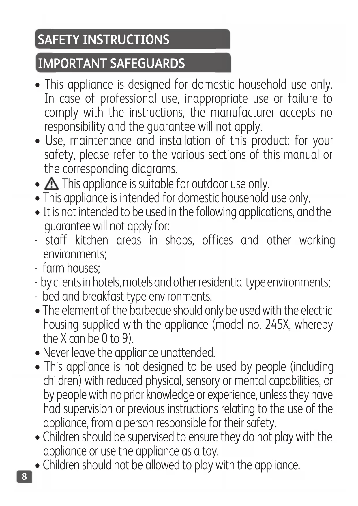 - The element of the barbecue should only be used with the electric housing supplied with the appliance (model no. 245X, whereby the X can be 0 to 9).