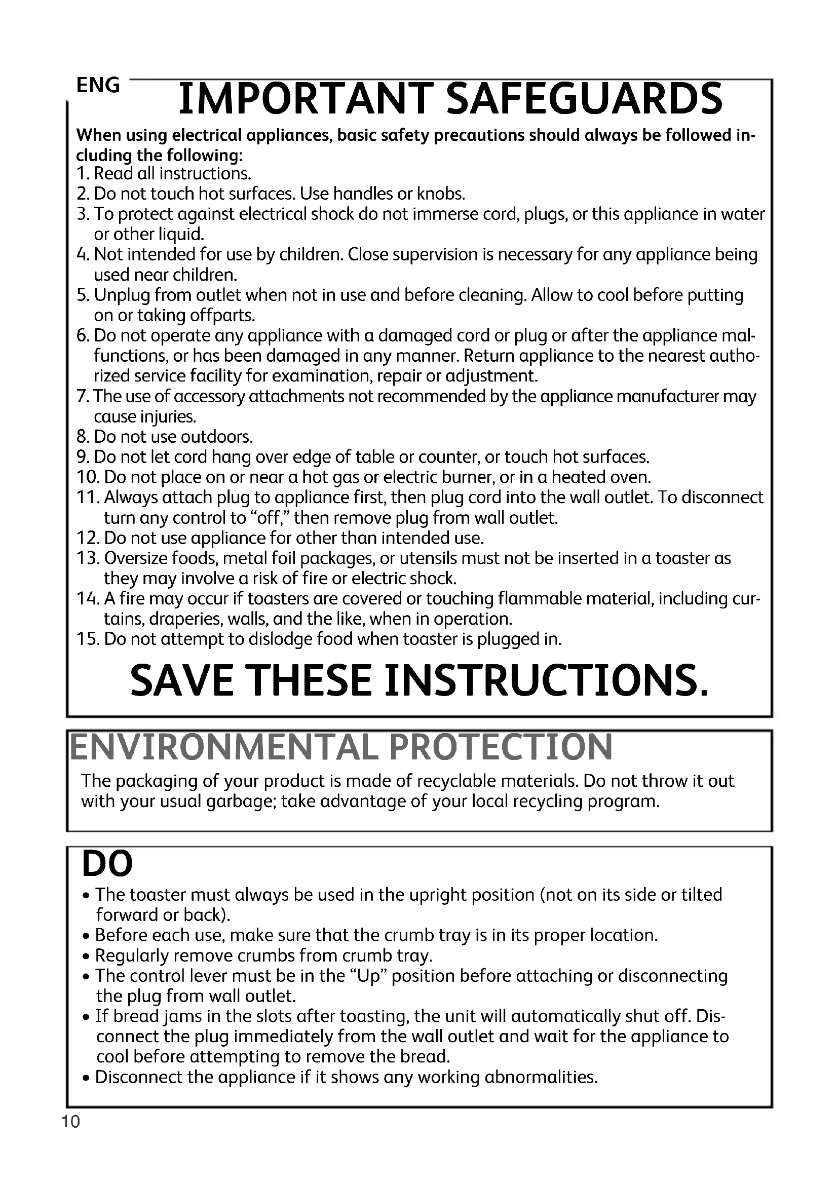 SAVE THESE INSTRUCTIONS. ENVIRONMENTAL PROTECTION The packaging of your product is made of recyclable materials. Do not throw it out with your usual garbage; take advantage of your local recycling program.