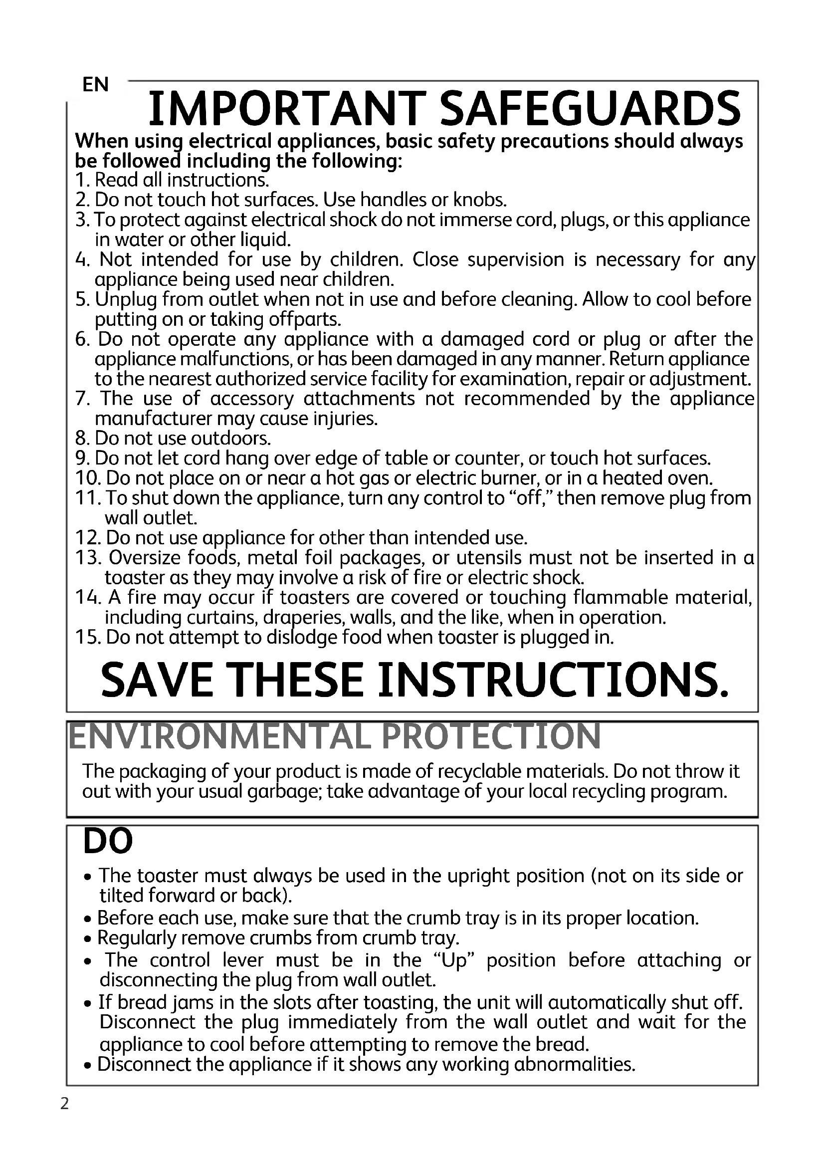 SAVE THESE INSTRUCTIONS. ENVIRONMENTAL PROTECTION The packaging of your product is made of recyclable materials. Do not throw it out with your usual garbage; take advantage of your local recycling program.