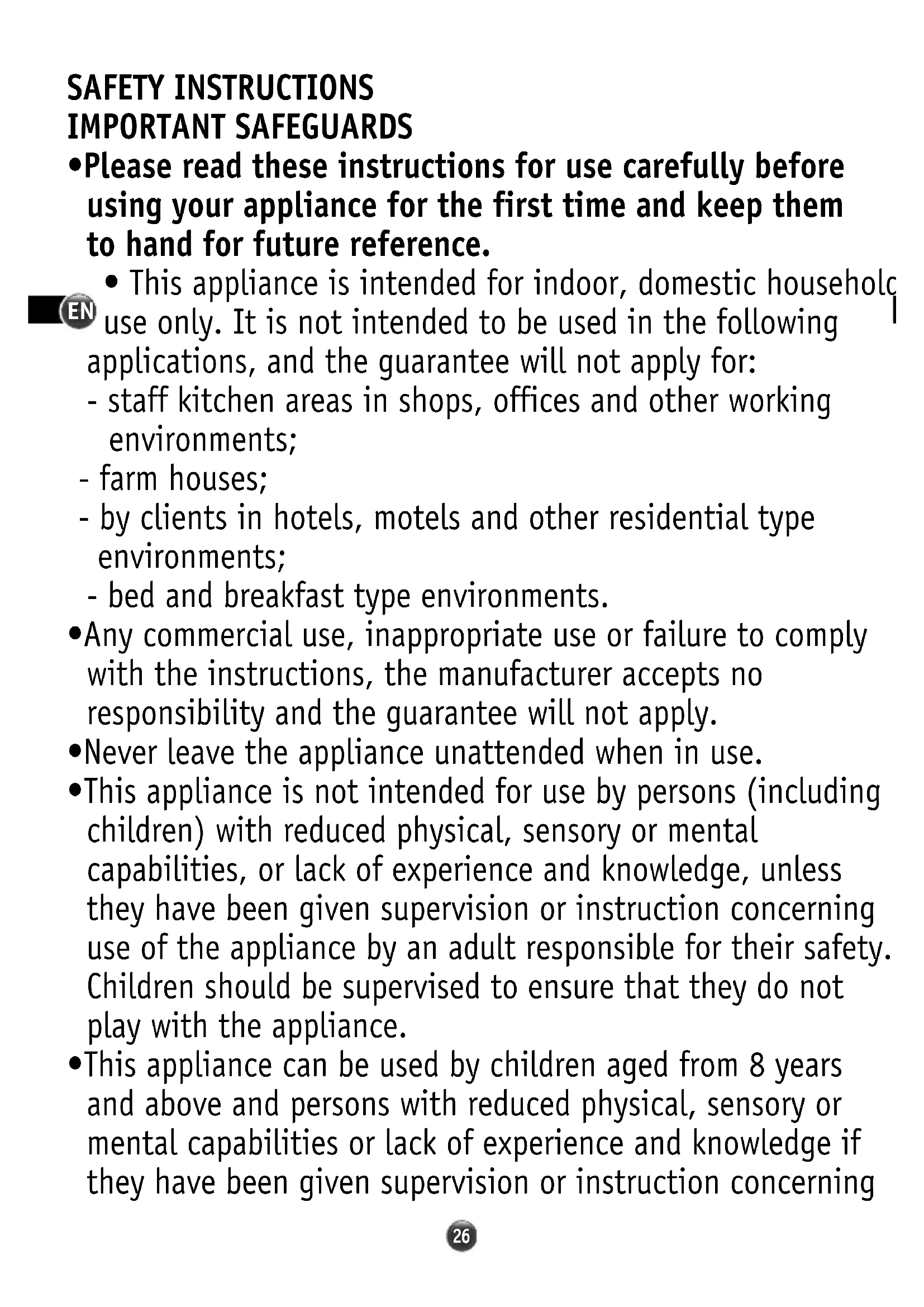 - This appliance is not intended for use by persons (including children) with reduced physical, sensory or mental capabilities, or lack of experience and knowledge, unless they have been given supervision or instruction concerning use of the appliance by an adult responsible for their safety. Children should be supervised to ensure that they do not play with the appliance.