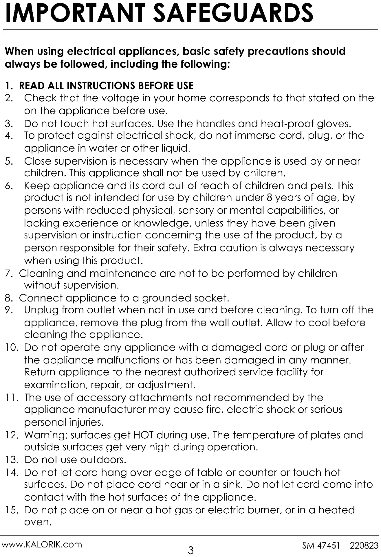 www.KALORIK.com SM 47451 – 220823 IMPORTANT SAFEGUARDS When using electrical appliances, basic safety precautions should always be followed, including the following: