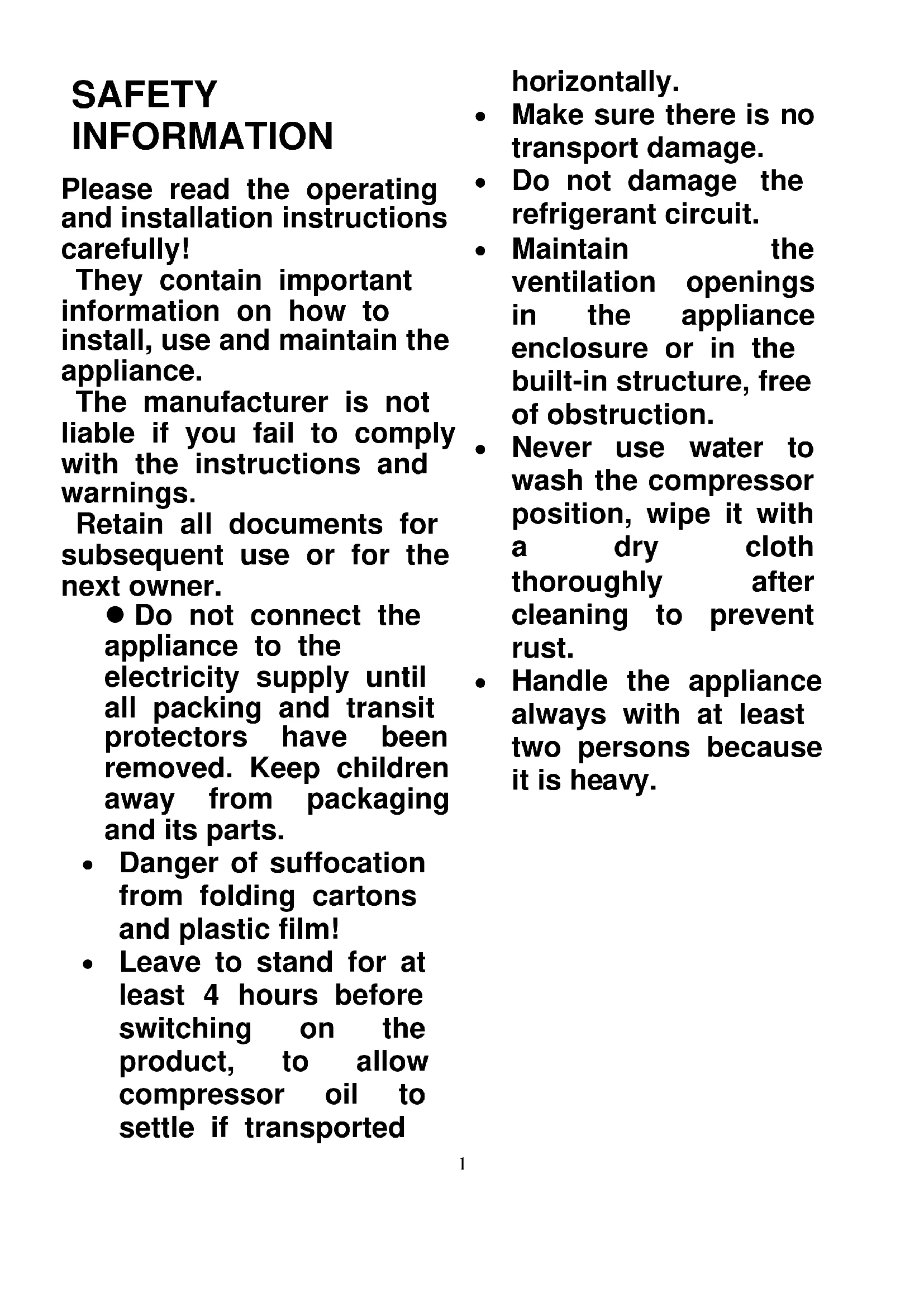 Handle the appliance always with at least two persons because it is heavy.2
