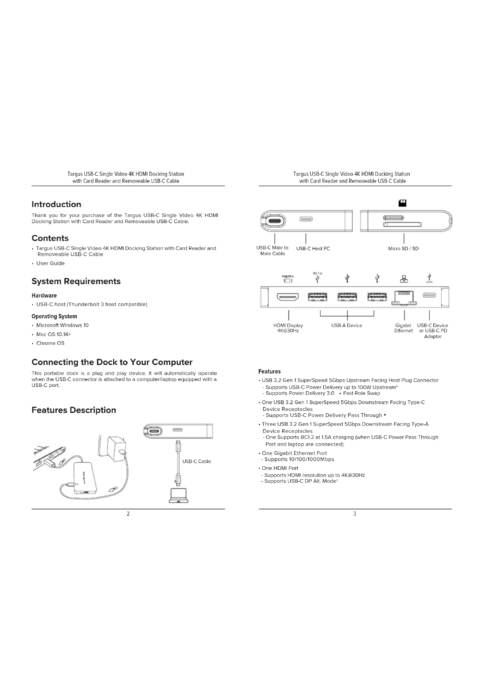 - Chrome OS Connecting the Dock to Your Computer This portable dock is a plug and play device. It will automatically operate when the USB-C connector is attached to a computer/laptop equipped with a USB-C port. Features Description USB-C Device or USB-C PD Adapter Gigabit Ethernet HDMI Display 4K@30Hz USB-A Device Micro SD / SD Targus USB-C Single Video 4K HDMI Docking Station with Card Reader and Removeable USB-C Cable Targus USB-C Single Video 4K HDMI Docking Station with Card Reader and Removeable USB-C Cable USB-C Host PC USB-C Male to Male Cable USB-C Cable Features