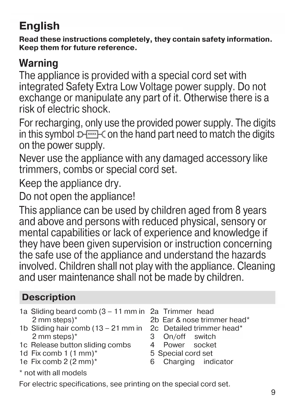 - Once the appliance is completely charged, discharge it through normal use. Then recharge to full capacity. Usage Attach or exchange the attachments only when the appliance is switched off. To turn the appliance on, slide the on/off switch (3) up. Beard Trimming / Hair Clipping Sliding combs (1a, 1b): Place one of the combs over the trimmer head (2a). Press the release button (1c) and slide the comb to your desired length. Fixed combs (1d, 1e): Click one of the combs onto the trimmer head (2a).