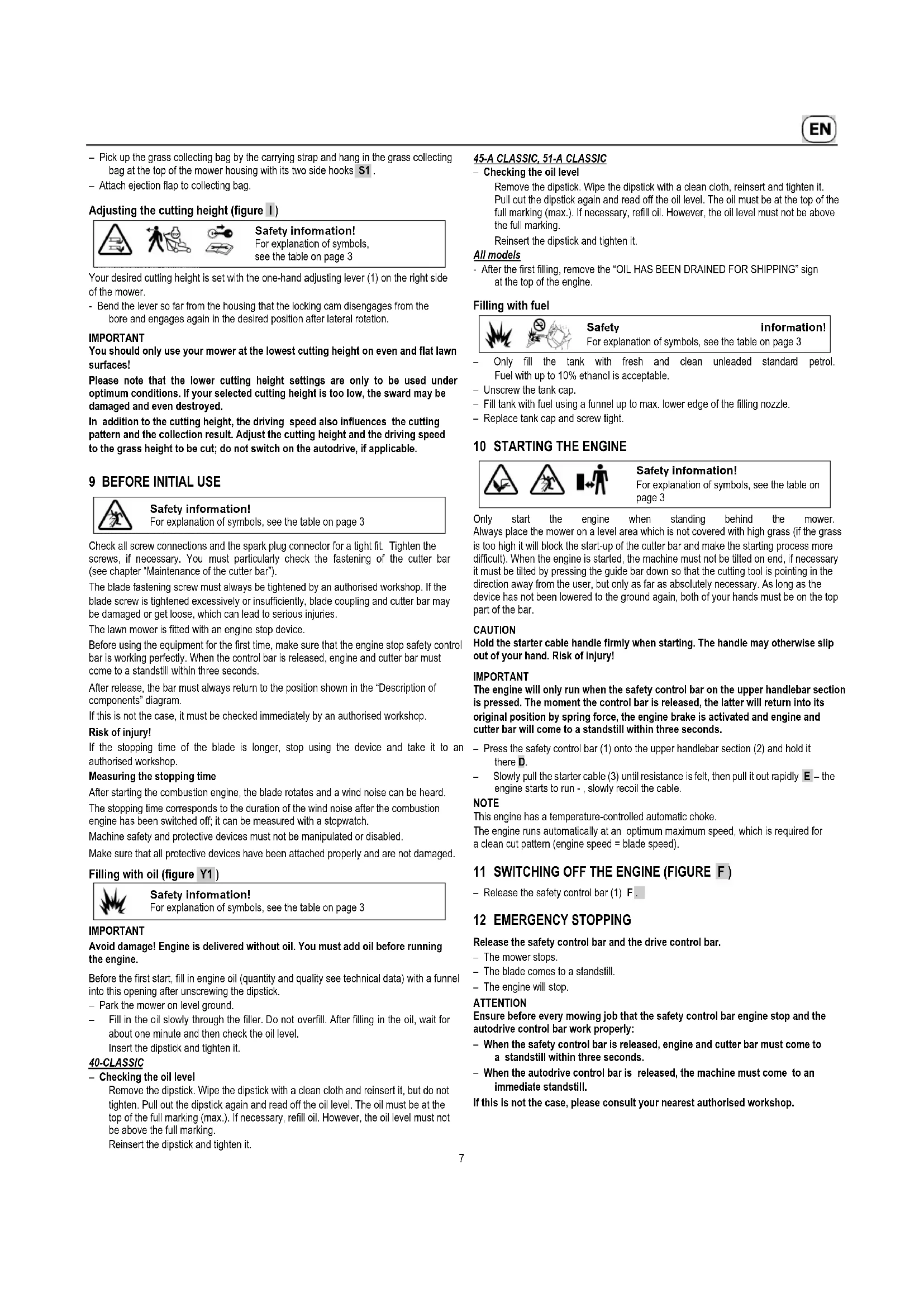 Stop the engine by releasing the engine stop bar, make sure that all moving parts have come to a complete standstill and the ignition key, if there is one, has been removed: – when you have to lift or tilt the mower e.g. for transportation; – when you need to transport the machine to and from the area to be mown; – when driving off the lawn; – if you have to leave the machine for a short time; - if you want to adjust the cutting height; – before you remove the grass collecting bag; – before you remove the mulch plug; – before you fill it with fuel. Only refill when the engine is cold!