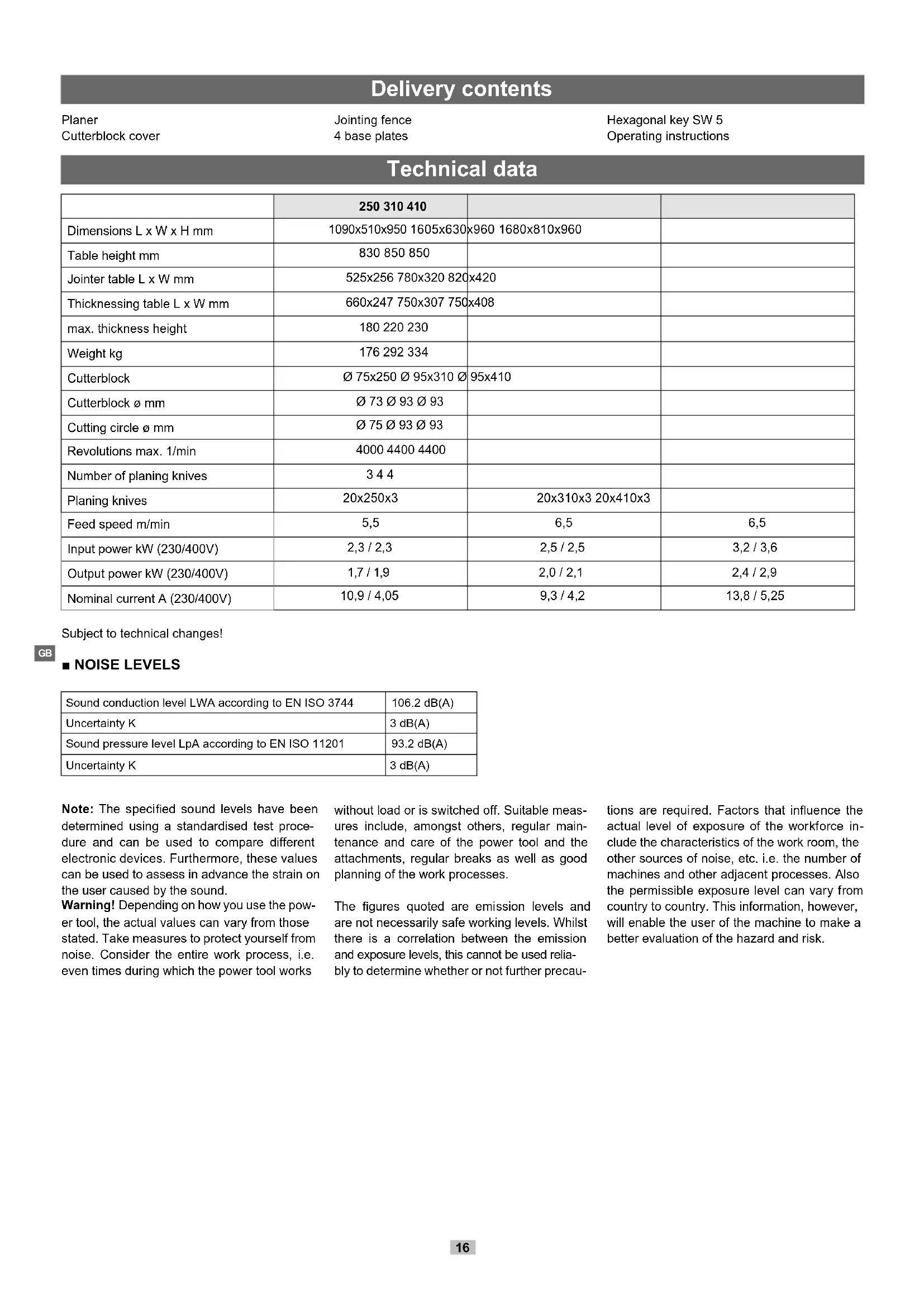 Planing knives 20x250x3 20x310x3 20x410x3 Feed speed m/min 5,5 6,5 6,5 Input power kW (230/400V) 2,3 / 2,3 2,5 / 2,5 3,2 / 3,6 Output power kW (230/400V) 1,7 / 1,9 2,0 / 2,1 2,4 / 2,9 Nominal current A (230/400V) 10,9 / 4,05 9,3 / 4,2 13,8 / 5,25 Subject to technical changes! ■ NOISE LEVELS Sound conduction level LWA according to EN ISO 3744 106.2 dB(A) Uncertainty K 3 dB(A) Sound pressure level LpA according to EN ISO 11201 93.2 dB(A) Uncertainty K 3 dB(A) Note: The specied sound levels have been determined using a standardised test proce- dure and can be used to compare different electronic devices. Furthermore, these values can be used to assess in advance the strain on the user caused by the sound. Warning! Depending on how you use the pow- er tool, the actual values can vary from those stated. Take measures to protect yourself from noise. Consider the entire work process, i.e. even times during which the power tool works without load or is switched off. Suitable meas- ures include, amongst others, regular main- tenance and care of the power tool and the attachments, regular breaks as well as good planning of the work processes. The gures quoted are emission levels and are not necessarily safe working levels. Whilst there is a correlation between the emission and exposure levels, this cannot be used relia- bly to determine whether or not further precau- tions are required. Factors that inuence the actual level of exposure of the workforce in- clude the characteristics of the work room, the other sources of noise, etc. i.e. the number of machines and other adjacent processes. Also the permissible exposure level can vary from country to country. This information, however, will enable the user of the machine to make a better evaluation of the hazard and risk.