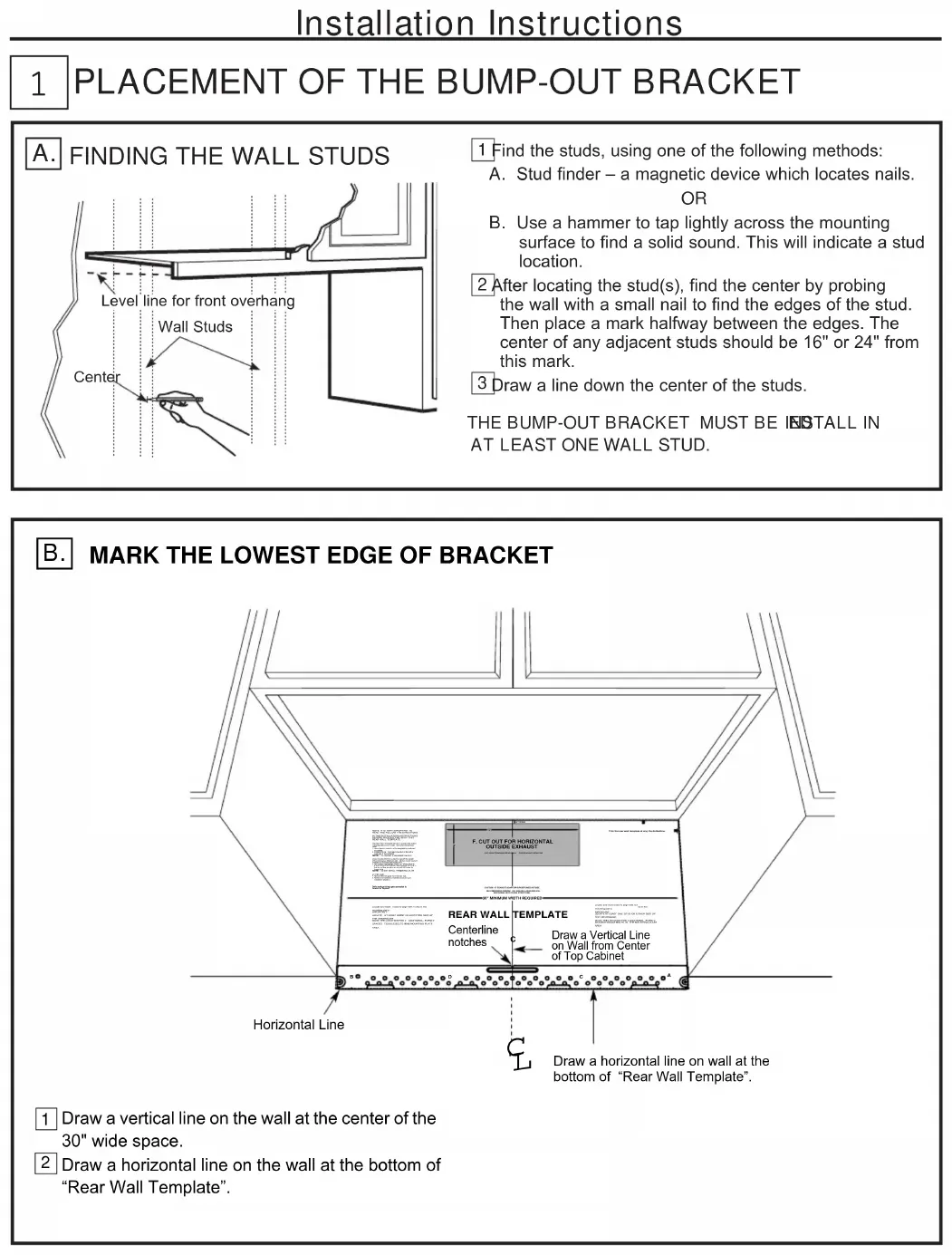 2Installation Instructions Find the studs, using one of the following methods: A. Stud finder – a magnetic device which locates nails. B. Use a hammer to tap lightly across the mounting surface to find a solid sound. This will indicate a stud location. After locating the stud(s), find the center by probing the wall with a small nail to find the edges of the stud. Then place a mark halfway between the edges. The center of any adjacent studs should be 16" or 24" from this mark. Draw a line down the center of the studs.THE BUMP-OUT BRACKET MUST BE ED LEAST ONE WALL STUD.