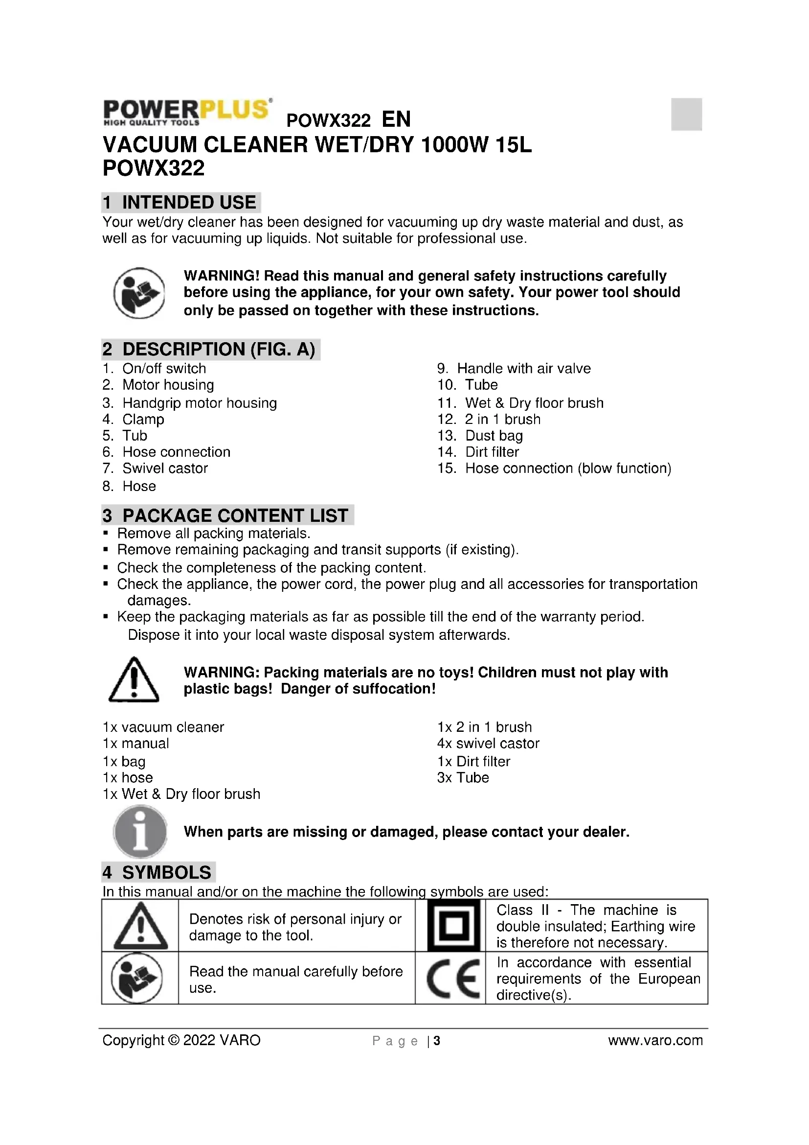 POWX322 1 INTENDED USE Your wet/dry cleaner has been designed for vacuuming up dry waste material and dust, as well as for vacuuming up liquids. Not suitable for professional use. WARNING! Read this manual and general safety instructions carefully before using the appliance, for your own safety. Your power tool should only be passed on together with these instructions. 2 DESCRIPTION (FIG. A)