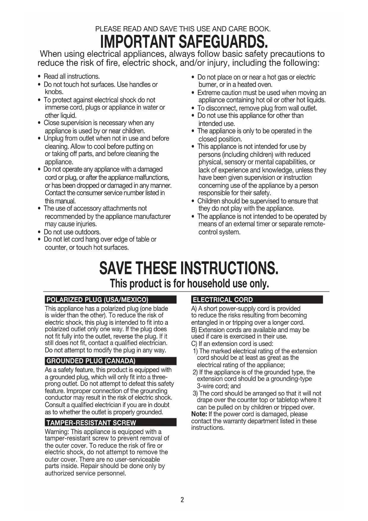 - The appliance is not intended to be operated by means of an external timer or separate remote- control system. PLEASE READ AND SAVE THIS USE AND CARE BOOK. IMPORTANT SAFEGUARDS. When using electrical appliances, always follow basic safety precautions to reduce the risk of fire, electric shock, and/or injury, including the following: SAVE THESE INSTRUCTIONS. This product is for household use only. POLARIZED PLUG (USA/MEXICO) This appliance has a polarized plug (one blade is wider than the other). To reduce the risk of electric shock, this plug is intended to t into a polarized outlet only one way. If the plug does not t fully into the outlet, reverse the plug. If it still does not t, contact a qualied electrician. Do not attempt to modify the plug in any way. GROUNDED PLUG (CANADA) As a safety feature, this product is equipped with a grounded plug, which will only t into a three- prong outlet. Do not attempt to defeat this safety feature. Improper connection of the grounding conductor may result in the risk of electric shock. Consult a qualied electrician if you are in doubt as to whether the outlet is properly grounded. TAMPER-RESISTANT SCREW
