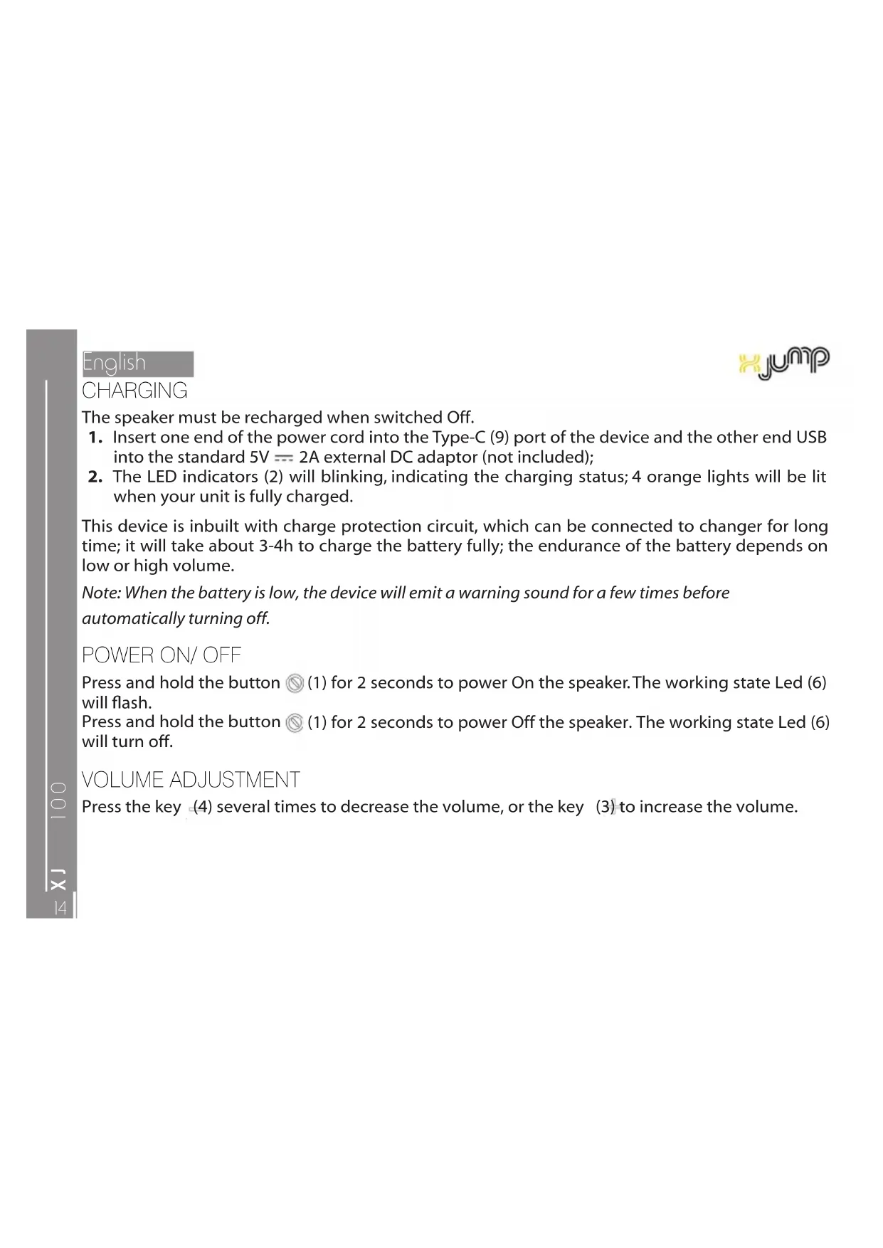 Press and hold the button (1) for 2 seconds to power On the speaker. The working state Led (6) will ash. Press and hold the button (1) for 2 seconds to power Off the speaker. The working state Led (6) will turn off. VOLUME ADJUSTMENT Press the key (4) several times to decrease the volume, or the key (3) to increase the volume. EnglishXJ 1 0 0